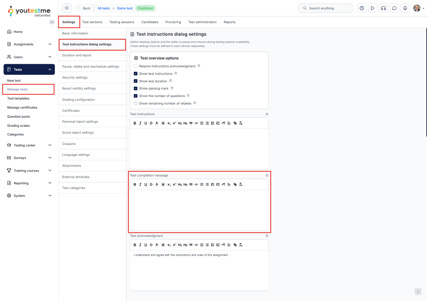 Setting a Test Completion Message from the Manage Tests tab