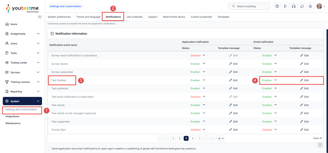 - From the Notification Event Name Column, select “Test finished”.