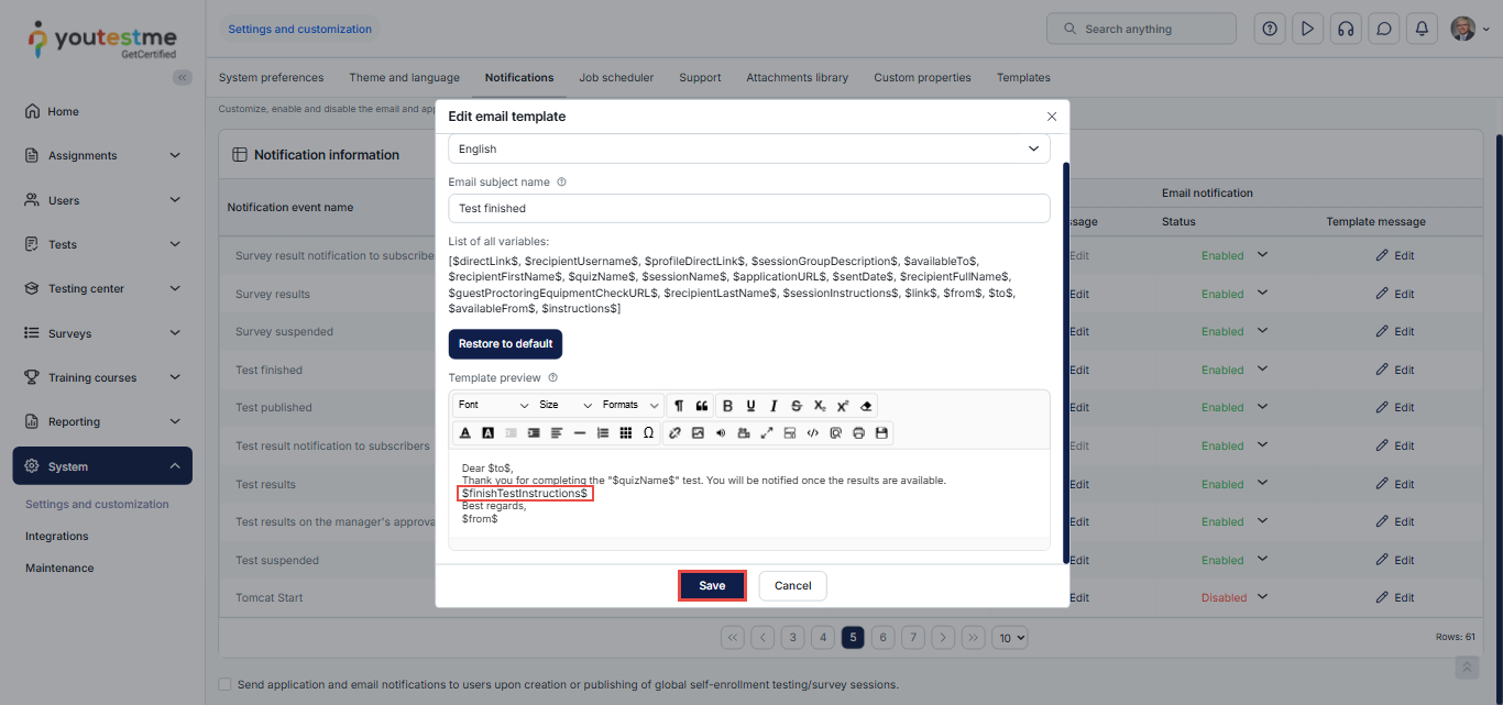 - Add the variable $finishTestInstructions$ to the body of the email.