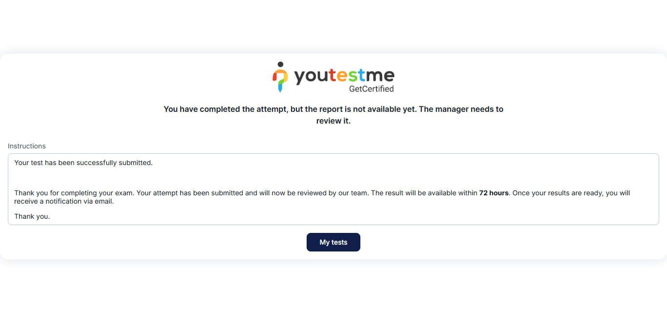 Note: The completion message is displayed to test takers upon finishing the test only when the results are delayed, such as when they require a manager’s approval or result verification.