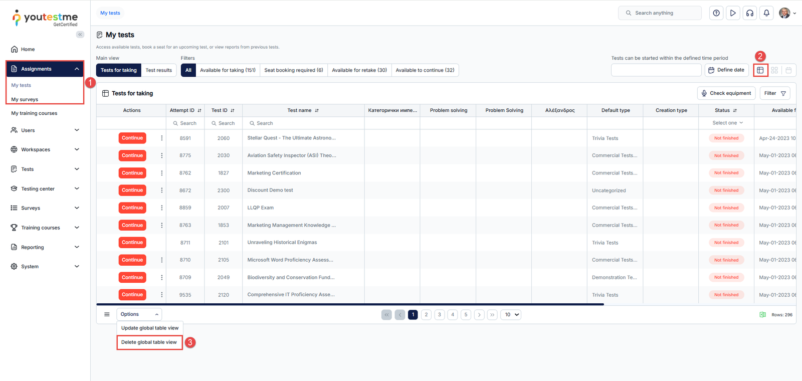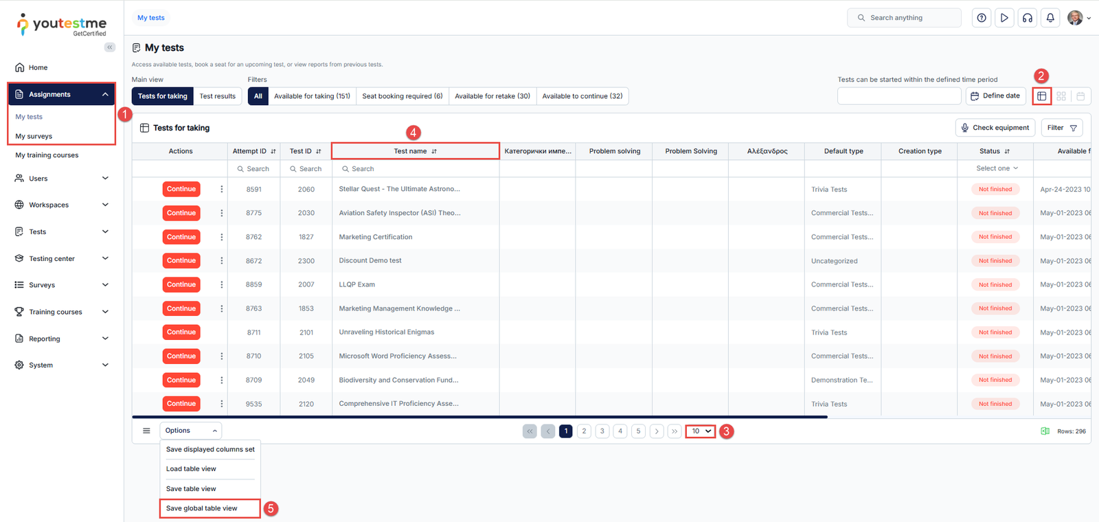 The YouTestMe application supports extending the test or survey list to display up to 1000 rows, with the option to apply and save a fixed alphabetical order across all users. This guide explains how to configure and manage this feature.
