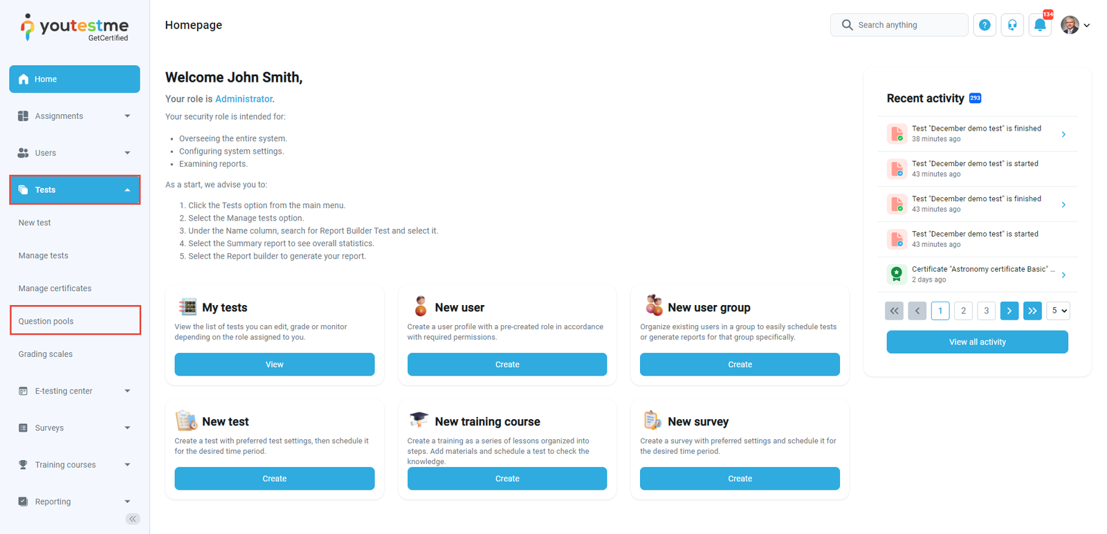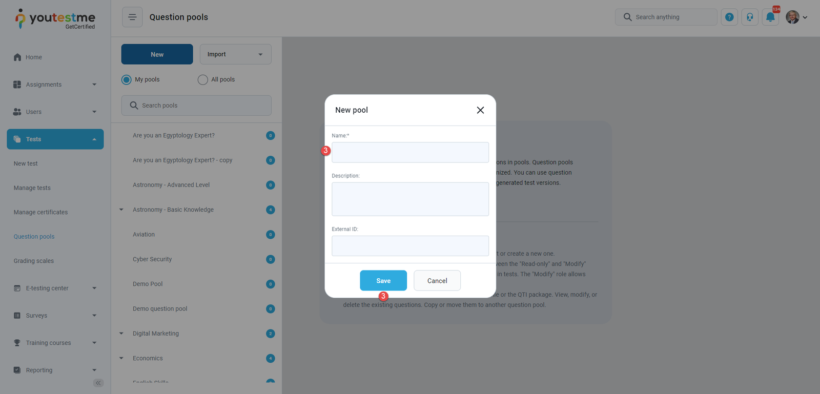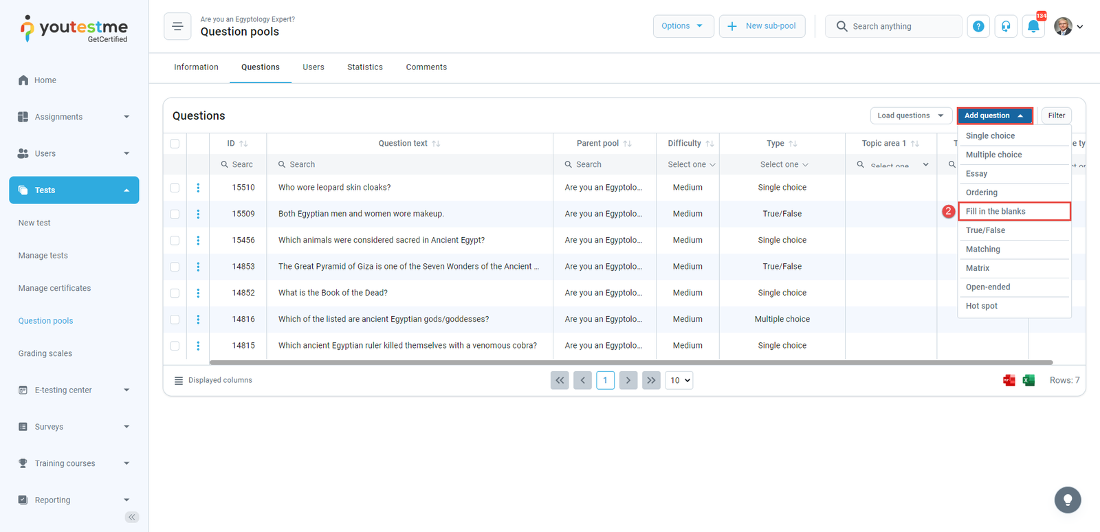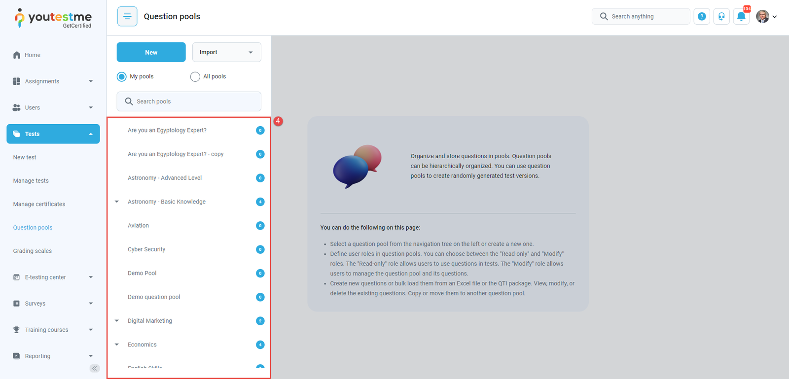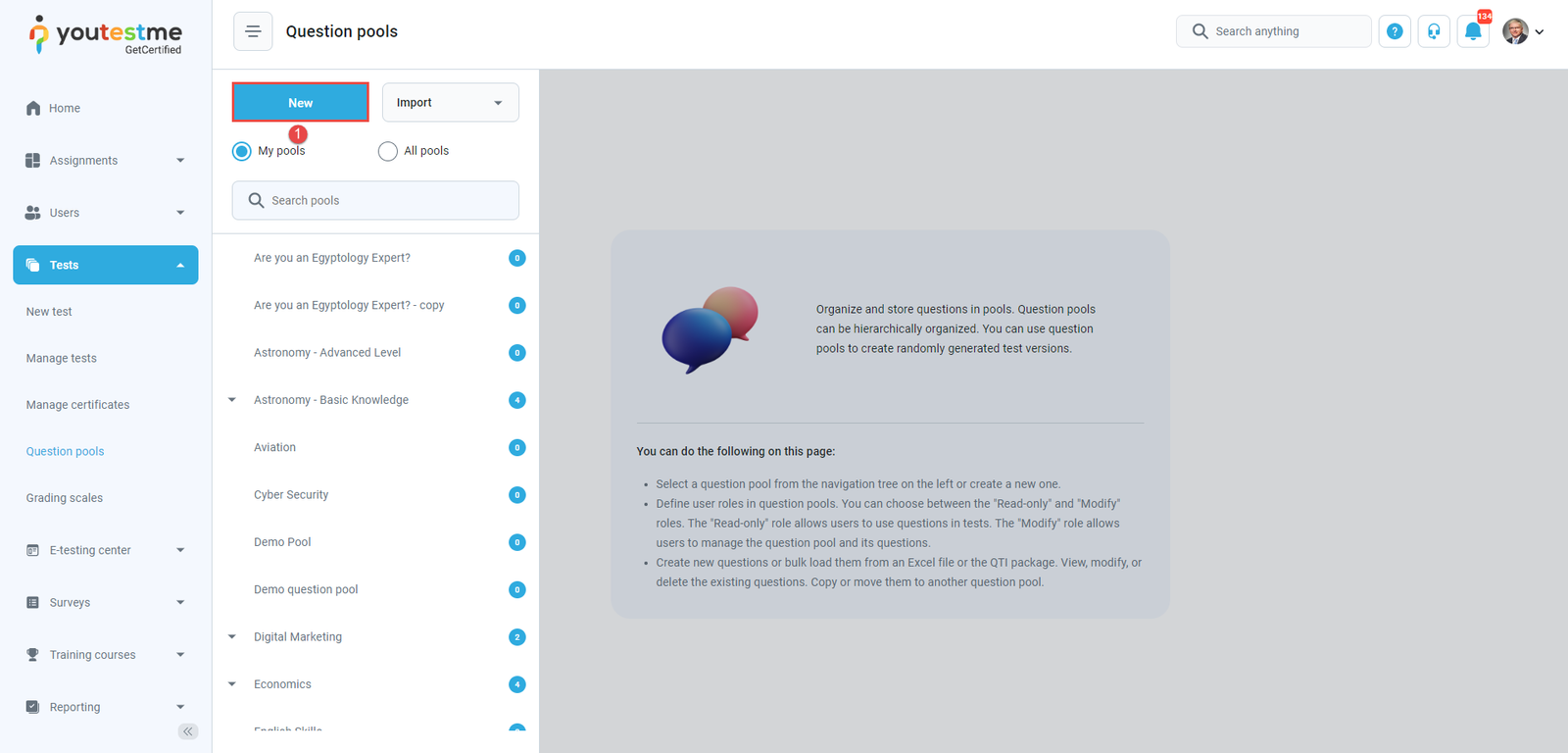 - To add questions to a question pool, select the Tests tab in the left-side menu and then the Question pools tab.