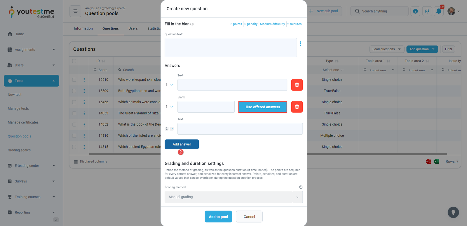 - To set up automatic grading for fill in the blanks question, specify the instructions in the Question text, click the Add answer button to add the new answer to the question, enter the answer text, and click the Use offered answers to add multiple offered answers to the blanks.