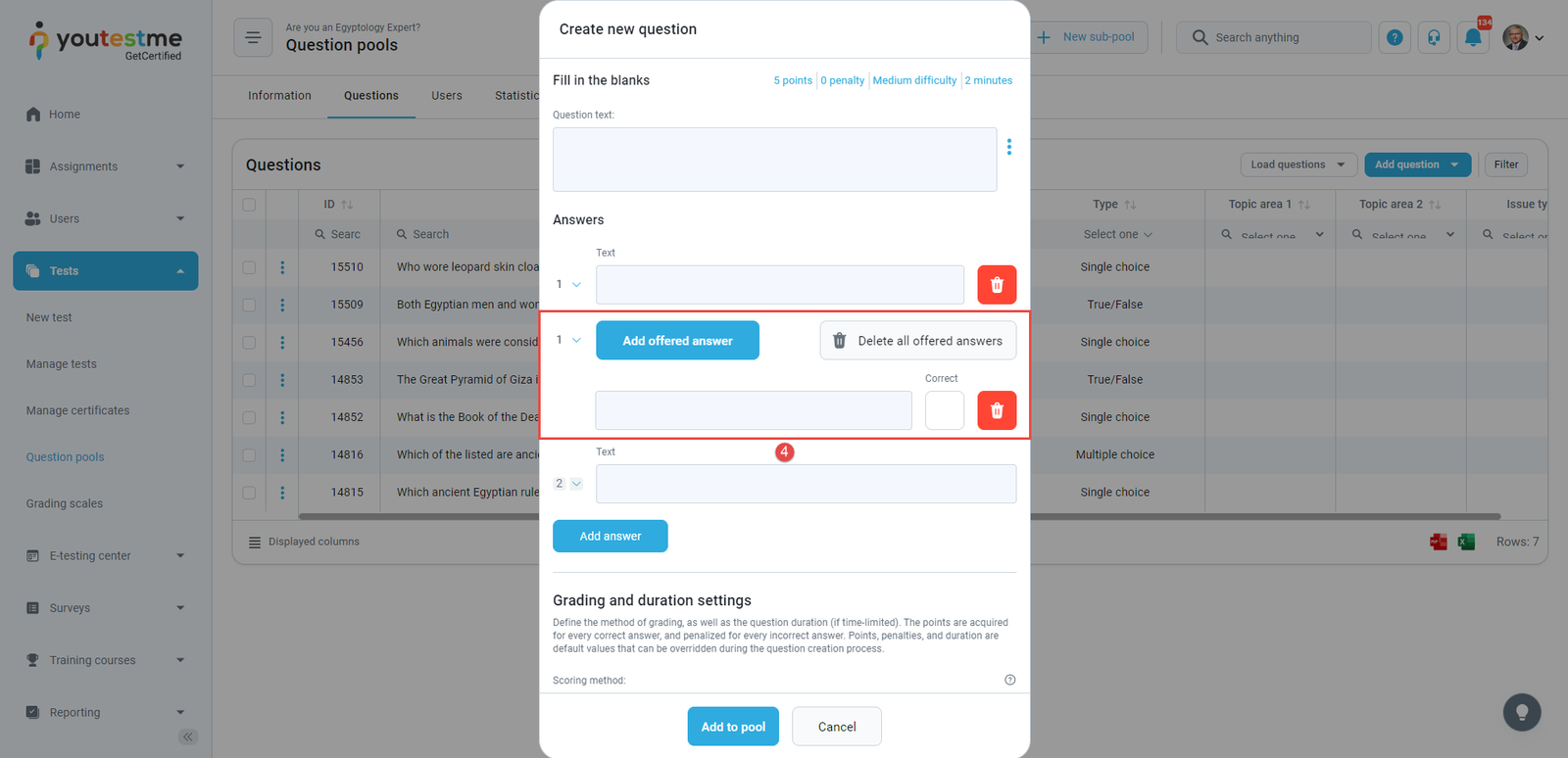 - Click the Add offered answers button to add as many blanks as you want. Specify the offered answers in the blank fields and mark the correct answer.