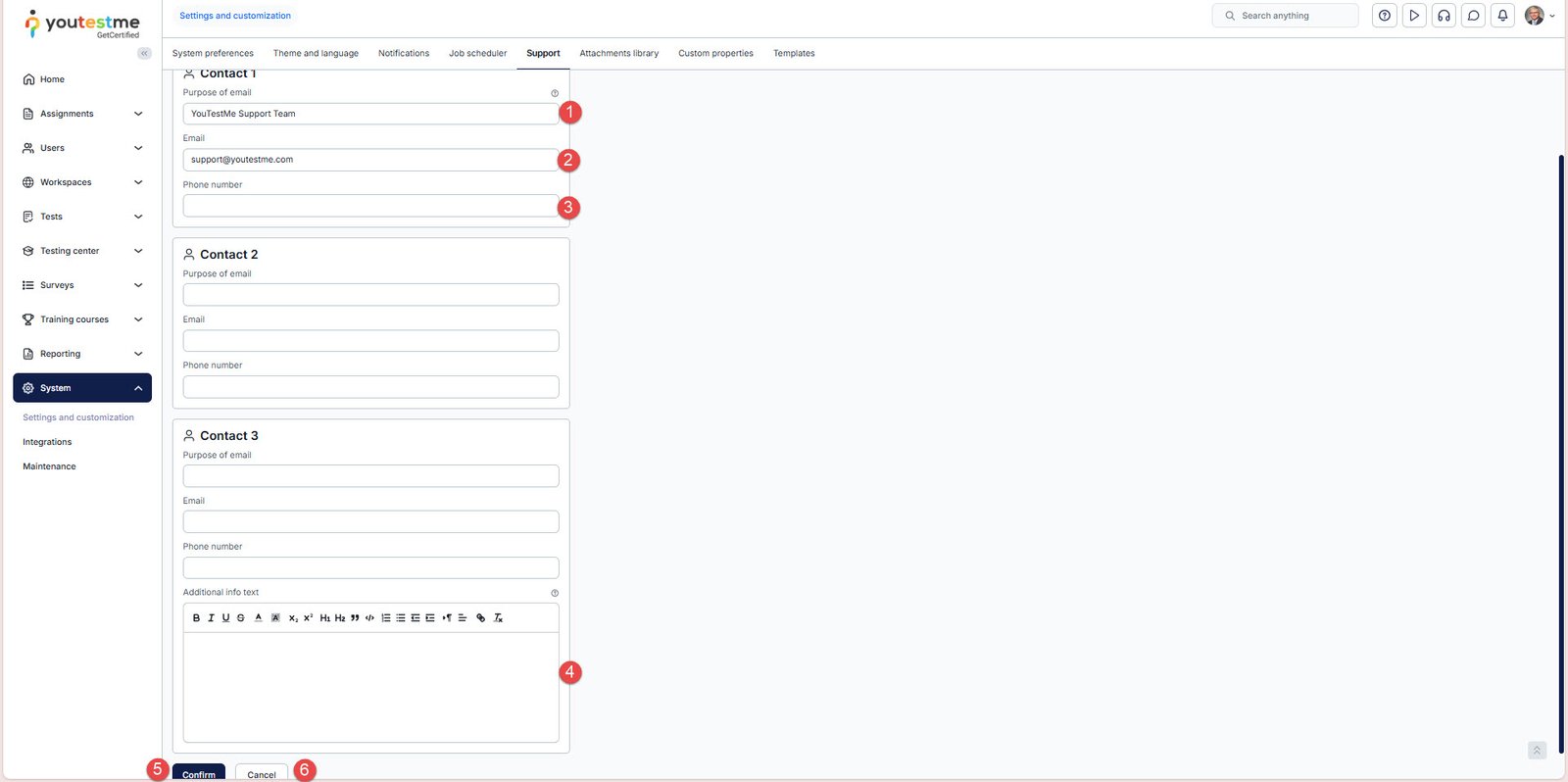 To define the support contact, select “System” from the left-side menu and choose “Settings and customization”, then navigate to the “Support” tab.