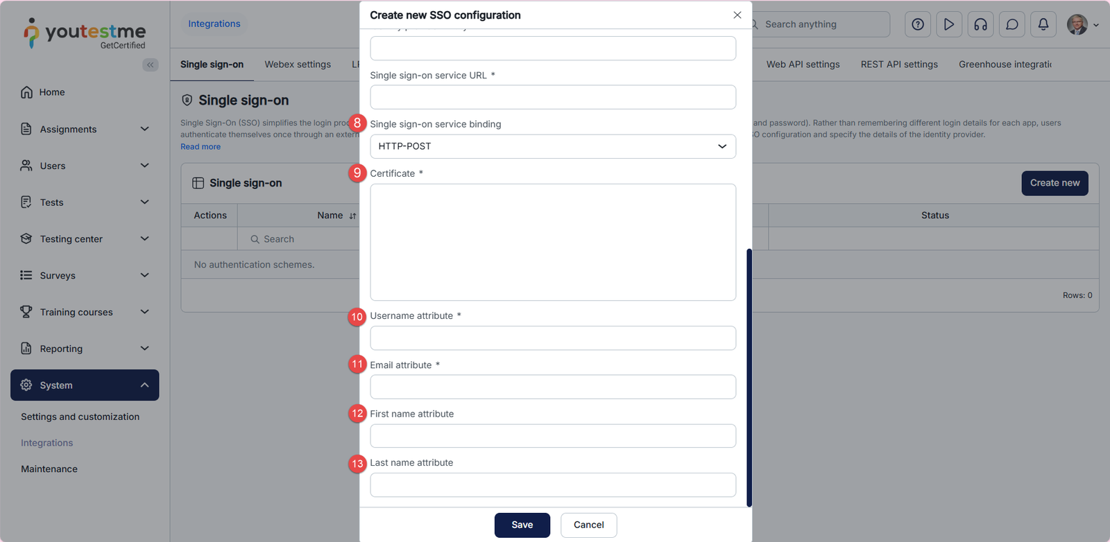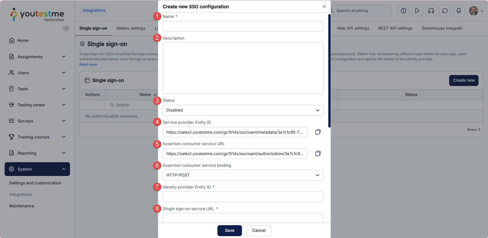 When creating a new SSO configuration, you need to enter the parameters for configuring the service provider’s side. GetCertified provides the parameters that you need to configure the identity provider’s side.