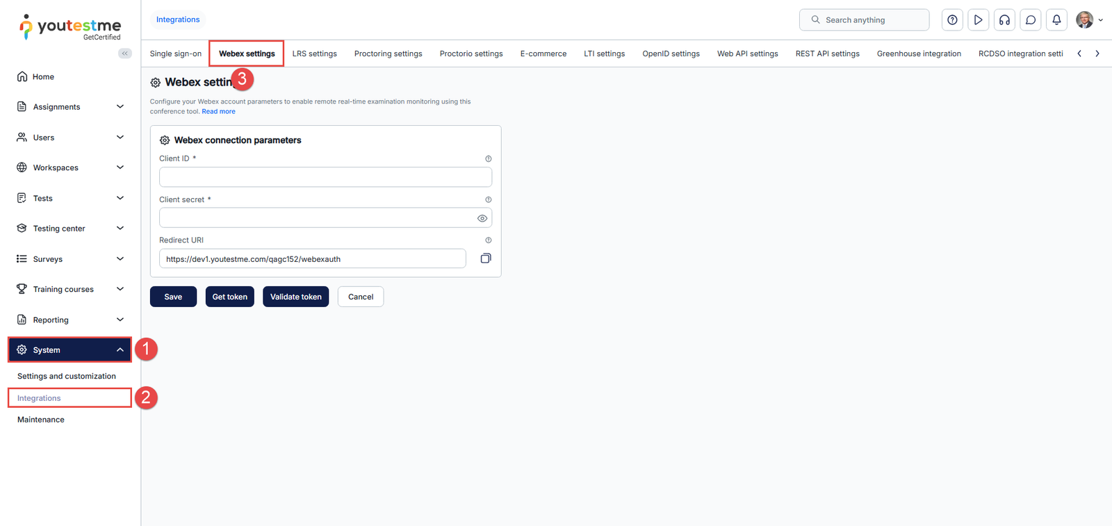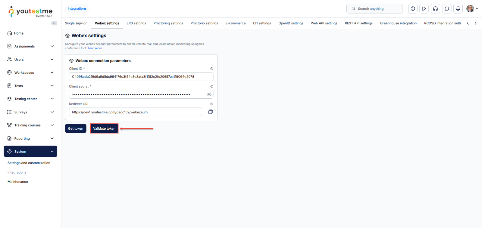 - Copy the Client Secret from the Webex website and paste it in the Client Secret field of the GetCertified application, under the Webex settings tab.