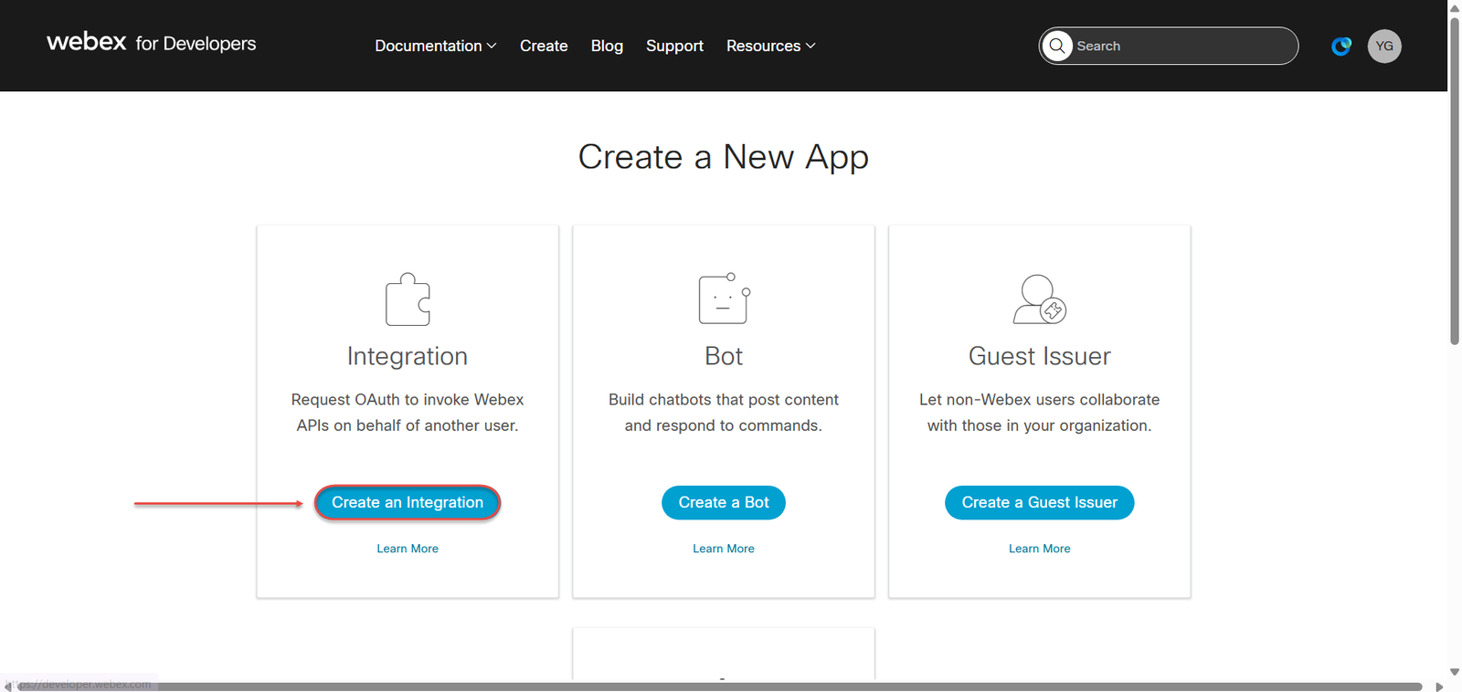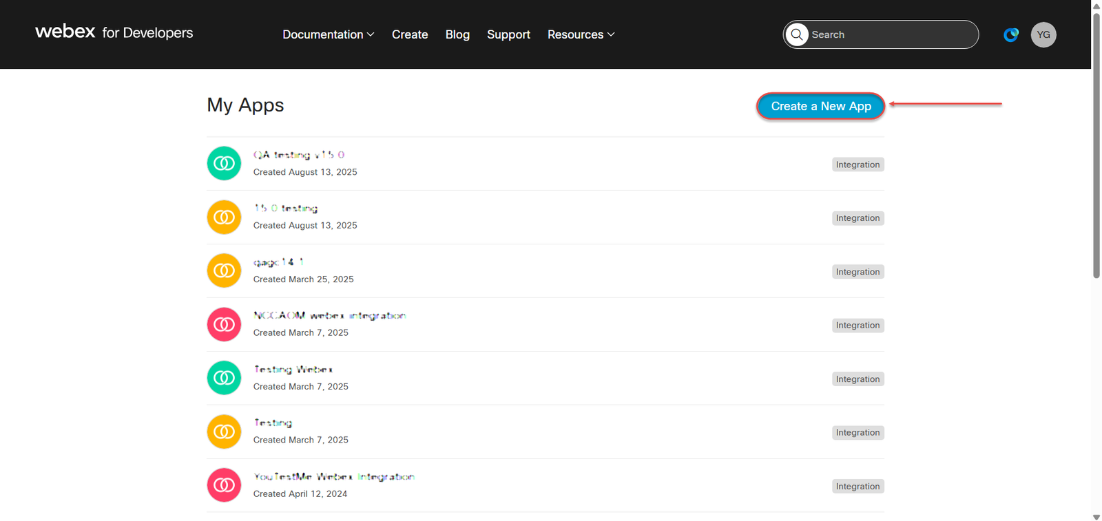 After logging into the application, select the My Webex Apps button and click the Create a New App button.