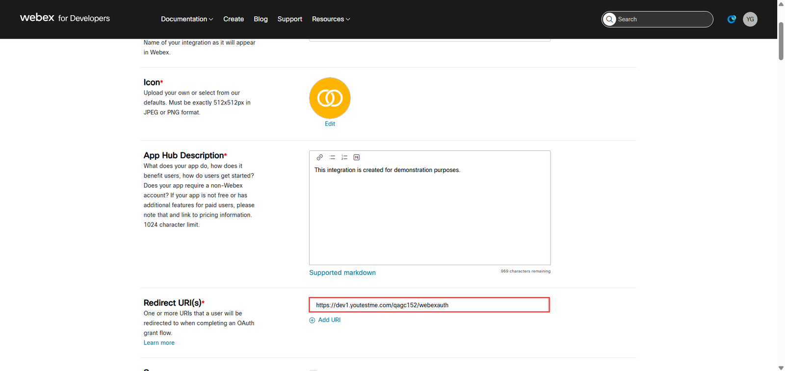Fill in the following fields: integration name, choose integration icon, and app hub description.