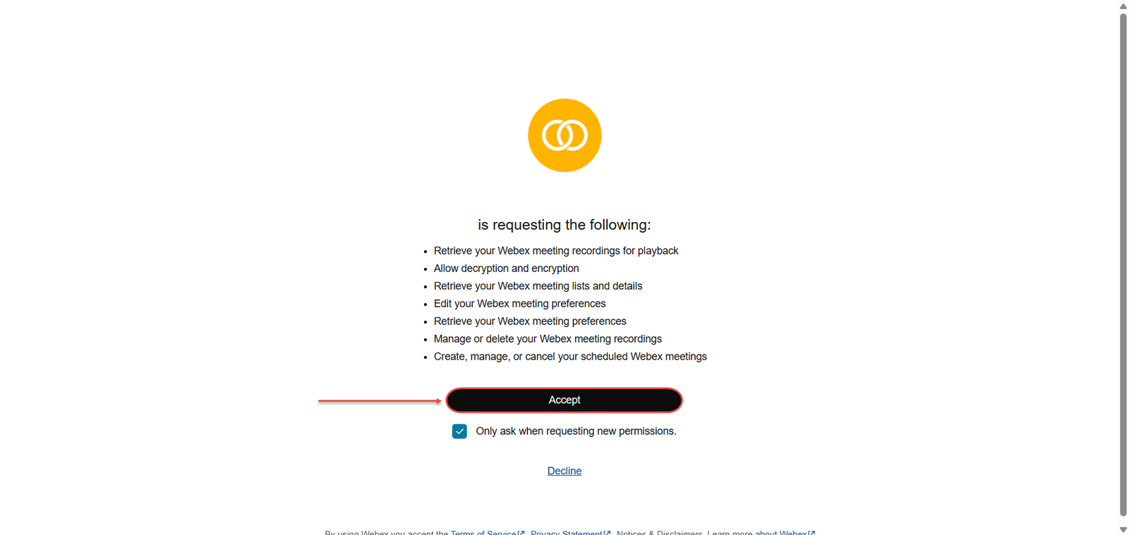 Click on the Get token button, and you will be redirected to the Webex page, where you should log in again with the hosting Webex account. Once you are logged in, click the Accept button.