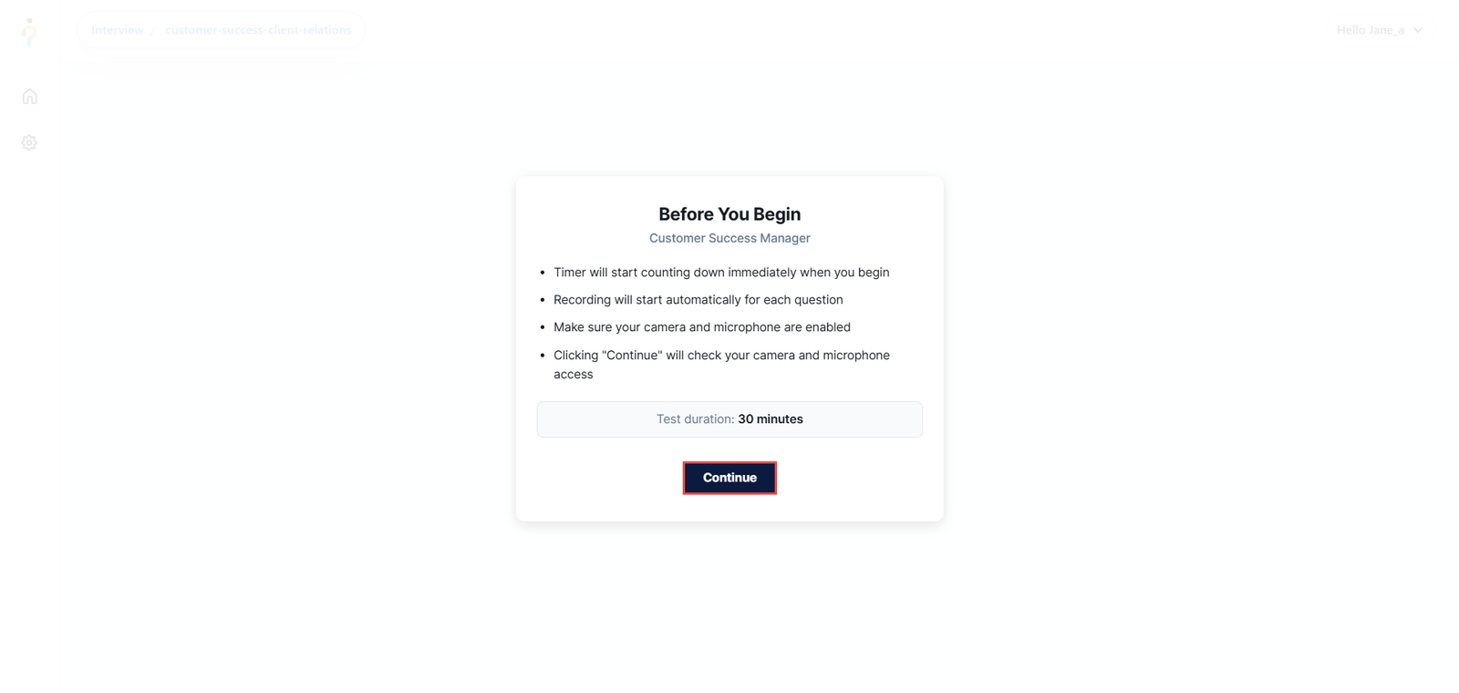 Once the candidate logs into the platform, they will see all available interviews, including their descriptions and summaries.
