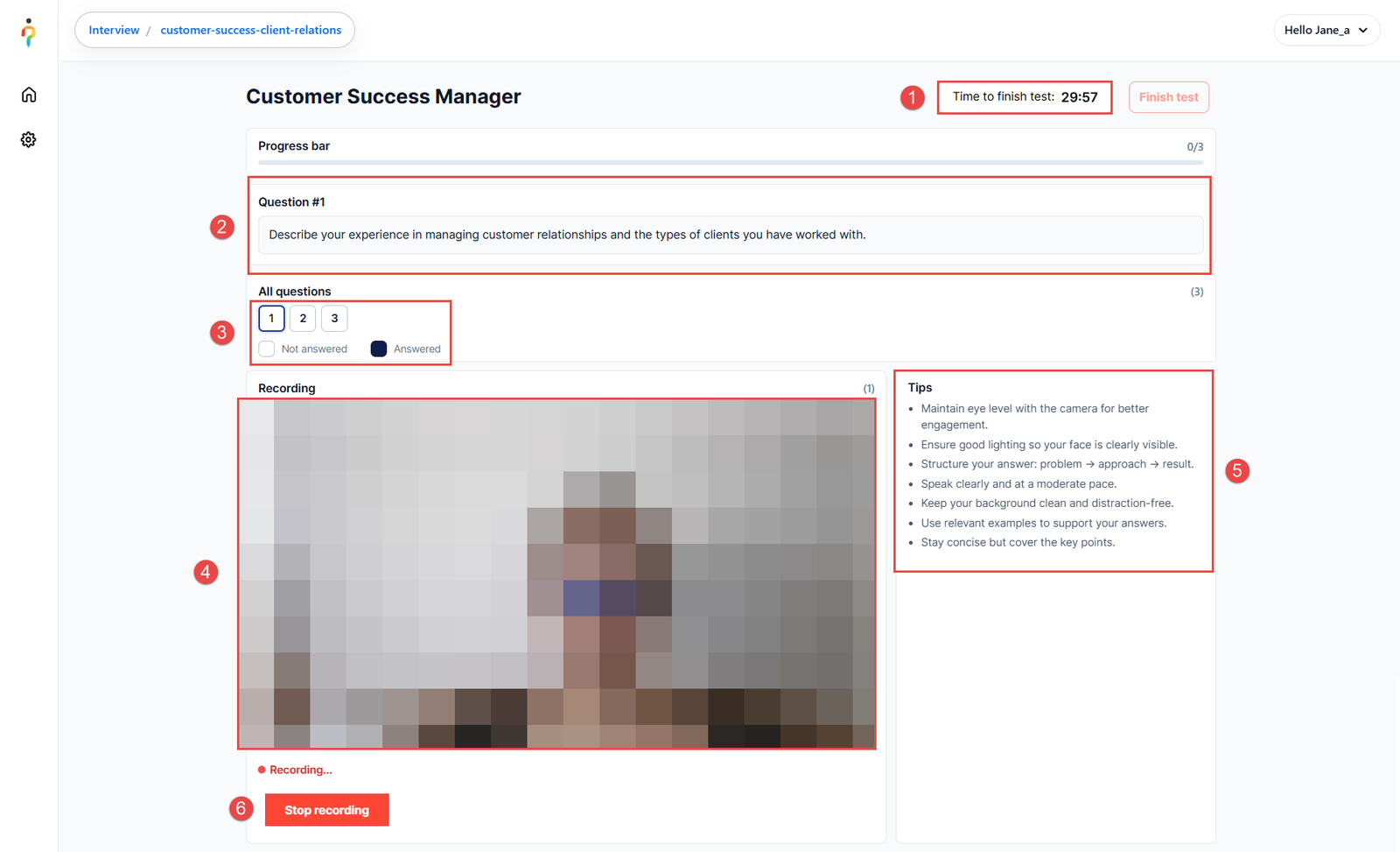- Stop Recording Option – After finishing their response, the candidate can select Stop Recording to complete the answer for that question.