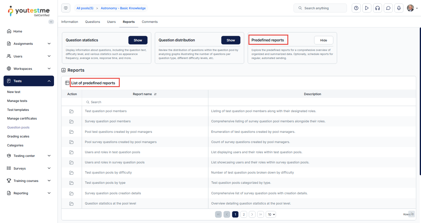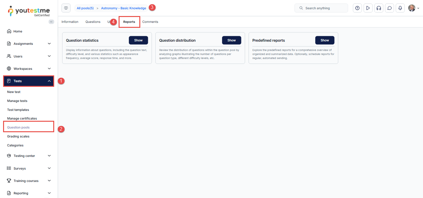 This article explains how to access and review statistics on questions in a selected question pool. Reports include candidate performance metrics and graphical breakdowns of question types and difficulty levels.