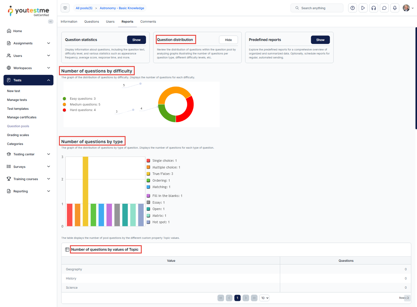 The Number of questions by values of Topic displays the number of questions in the pool grouped by the different custom property Topic values.