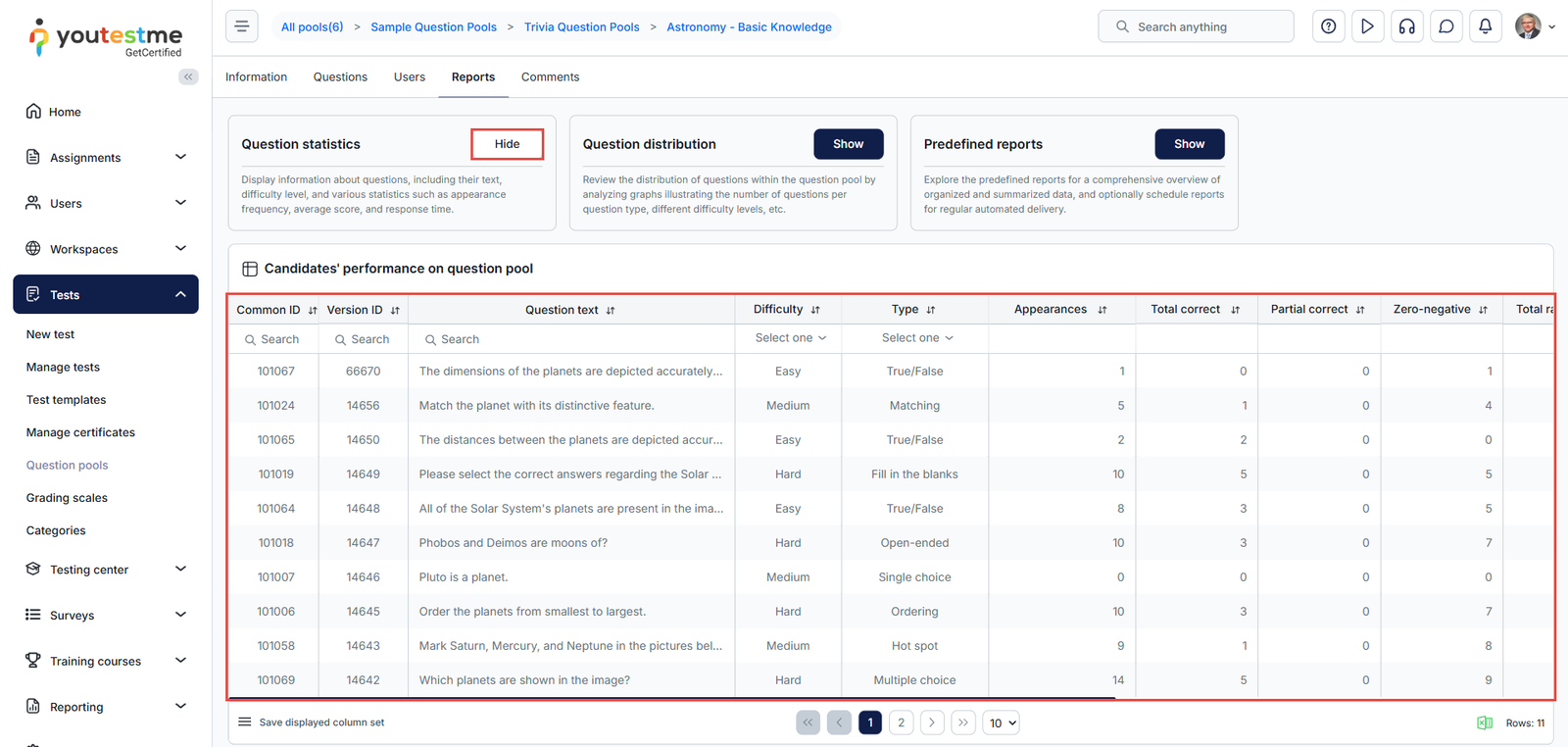 The Candidates’ performance on the question pool is a table of basic statistics of questions that shows the candidates’ performance and basic information about the questions. These statistics and data include the following: