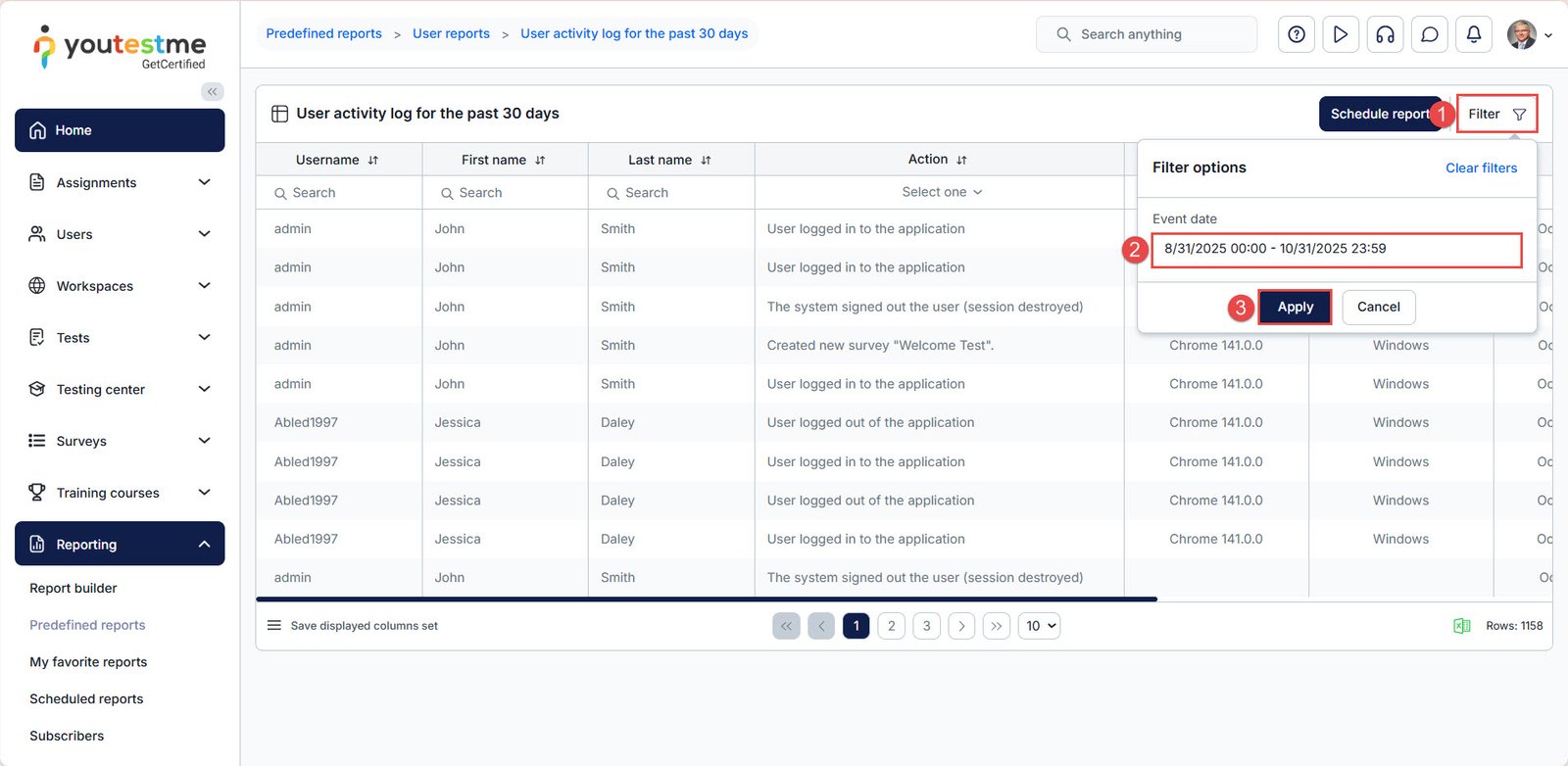 These filters help you focus on specific activities—ideal for scenarios like multi-day exams or reviewing detailed user interactions over a defined period.
