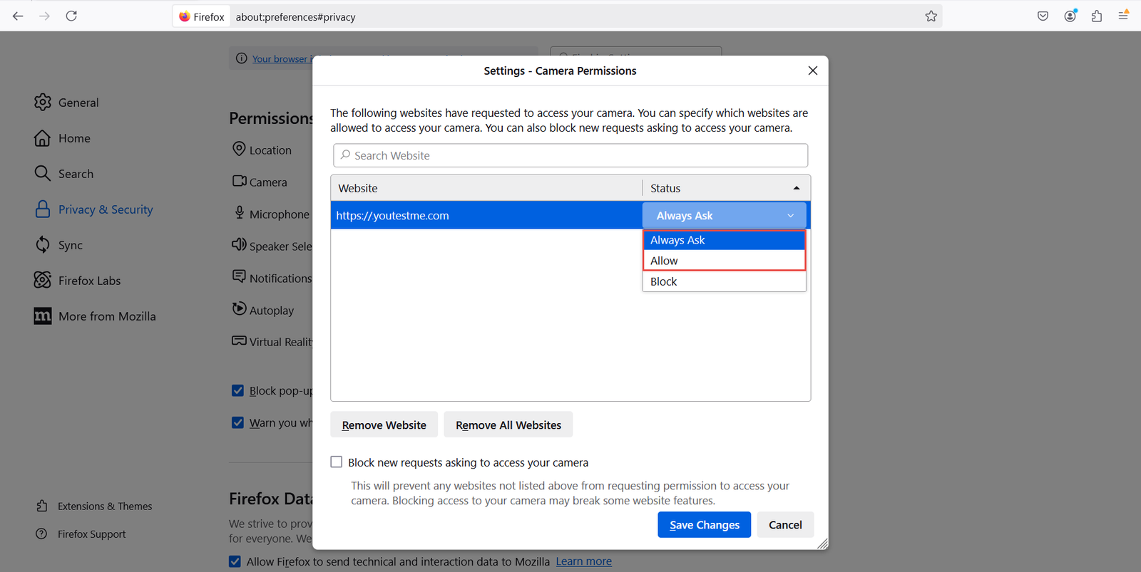 - On the Site Settings webpage, click the dropdown menu next to the camera icon and select Allow.