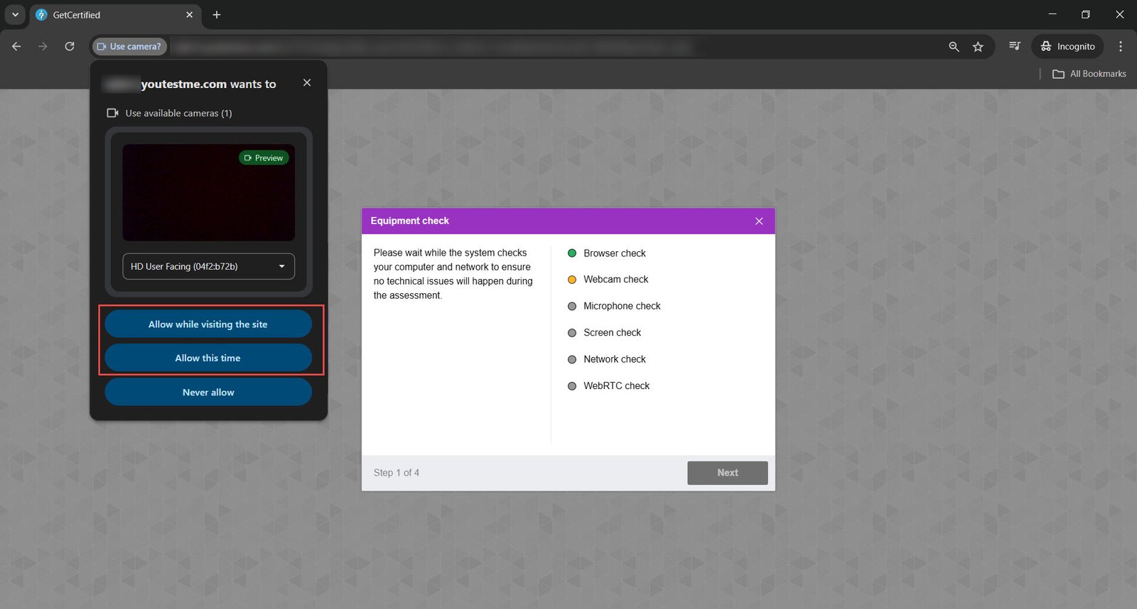 In the first step of this check, the system reviews browser permissions and tests the connected devices, including the webcam, microphone, screen sharing, and network.