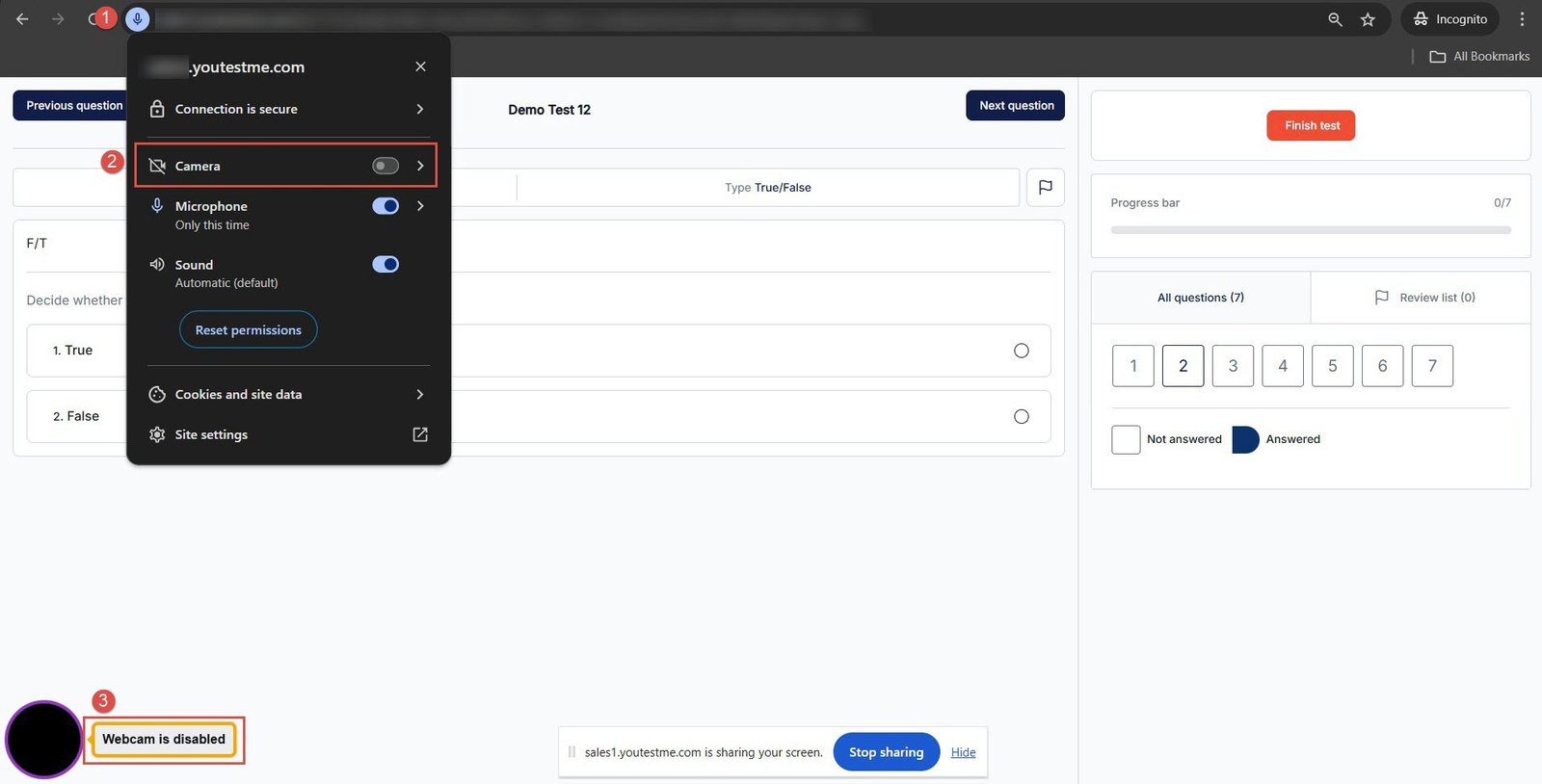The webcam is disabled during the test