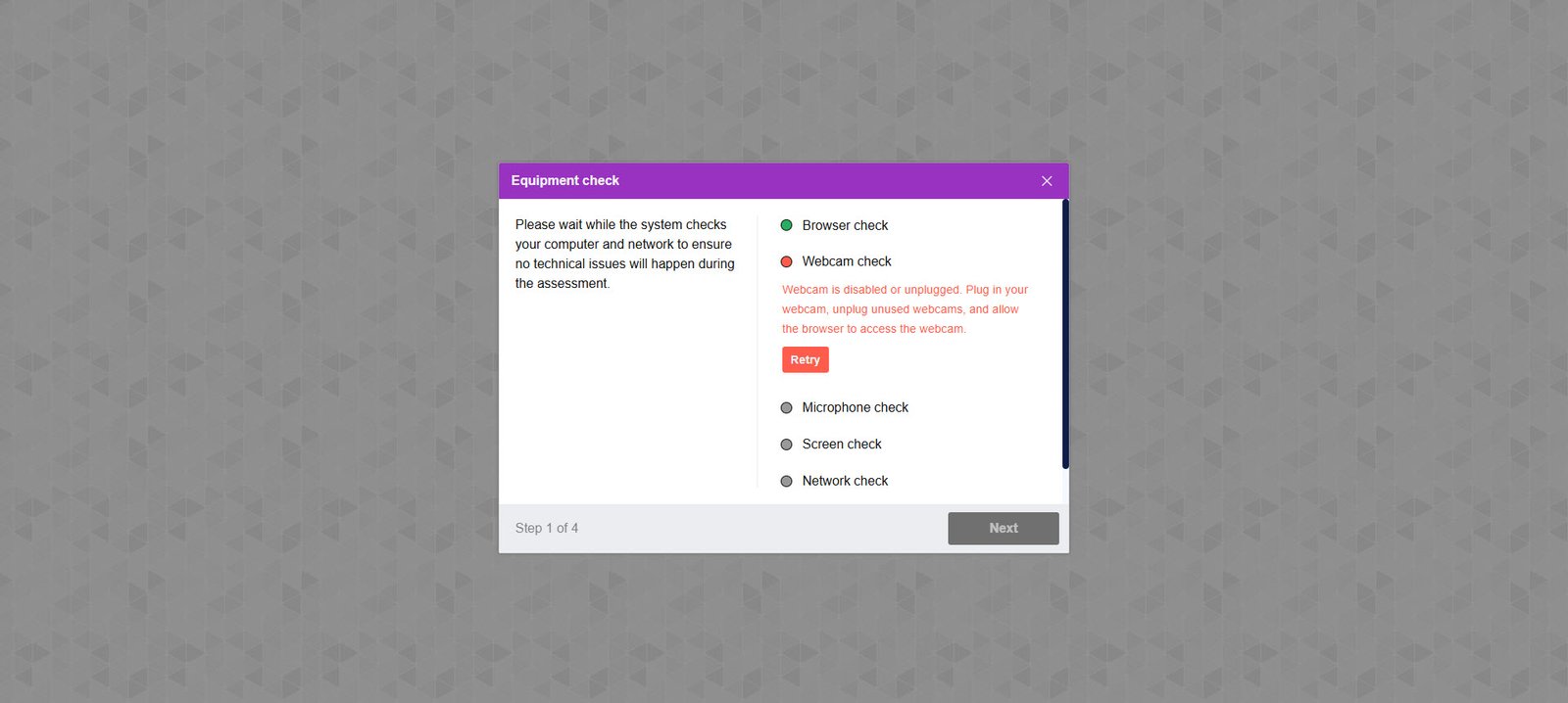 If the system is unable to connect to the webcam, a message will appear indicating that the webcam check has failed.