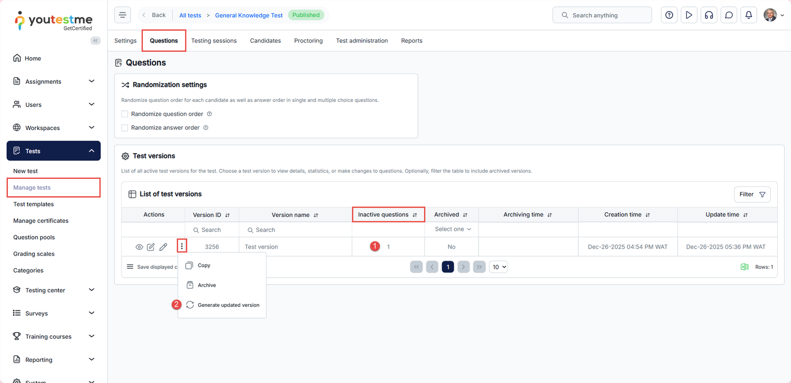 Navigate to the Manage Tests page and select the test you want to update. Then, go to the Questions section. The number of inactive questions will be displayed in the Inactive Questions column, indicating which questions require an update. - Generate an Updated Version