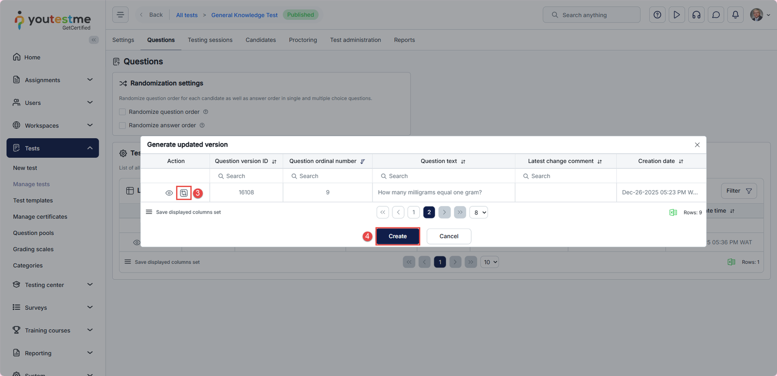 Click the Create button to confirm the changes. The updated version of the question will now appear in the test, ensuring that only the latest version is used.