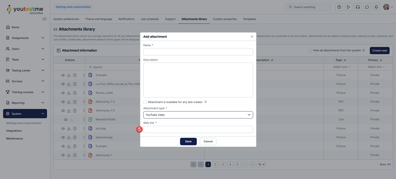The attachments library serves as a storage repository for all your attachments, including public attachments from other creators. Private attachments are visible only to you, while public attachments are accessible to all test creators. Attachments can be added to tests/surveys, training courses, questions, and user profiles. Additionally, attachments added to those pages will be displayed in this library.