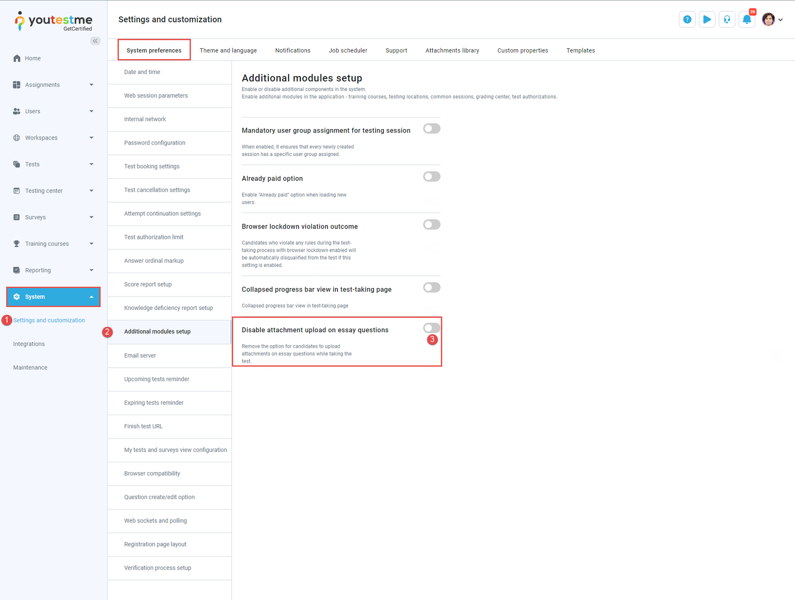 If you wish to disable the default option for candidates to upload attachments on essay questions during the test, do the following: