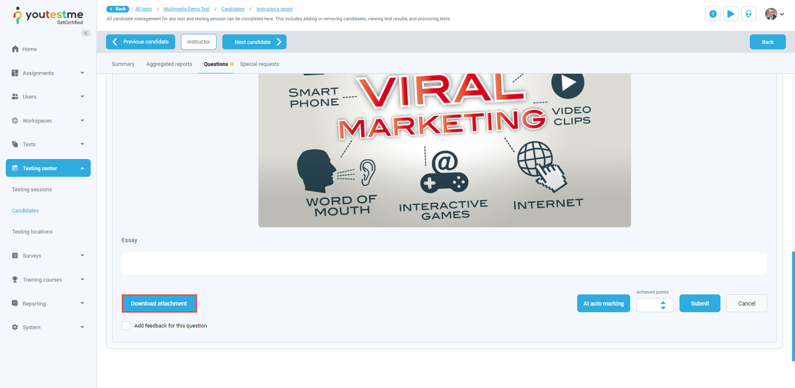 Once the candidate finishes the test, the instructor can download and preview the attachment by clicking the Download attachment button and then grade the question.