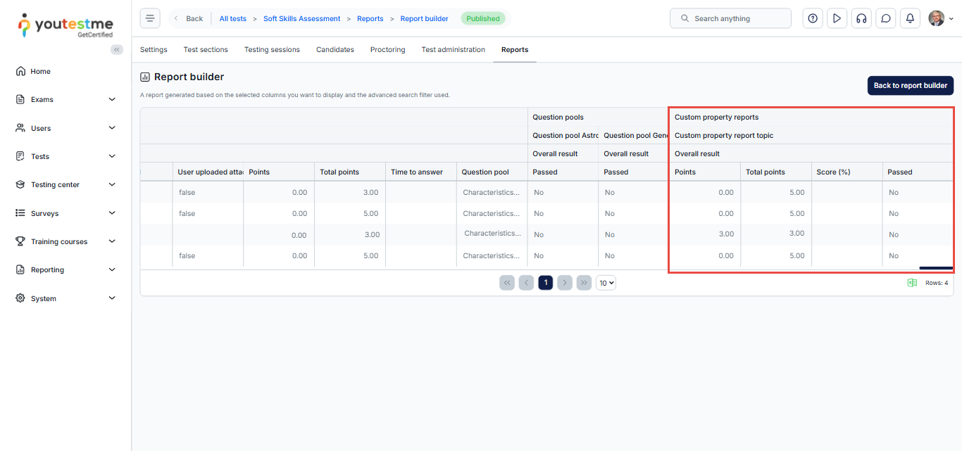Using custom question properties in the Report Builder helps you gain deeper insights into candidate performance by segmenting and evaluating based on question-level attributes. With proper setup, you can enhance your test analytics, enforce grading rules, and provide tailored reporting—all in just a few steps.