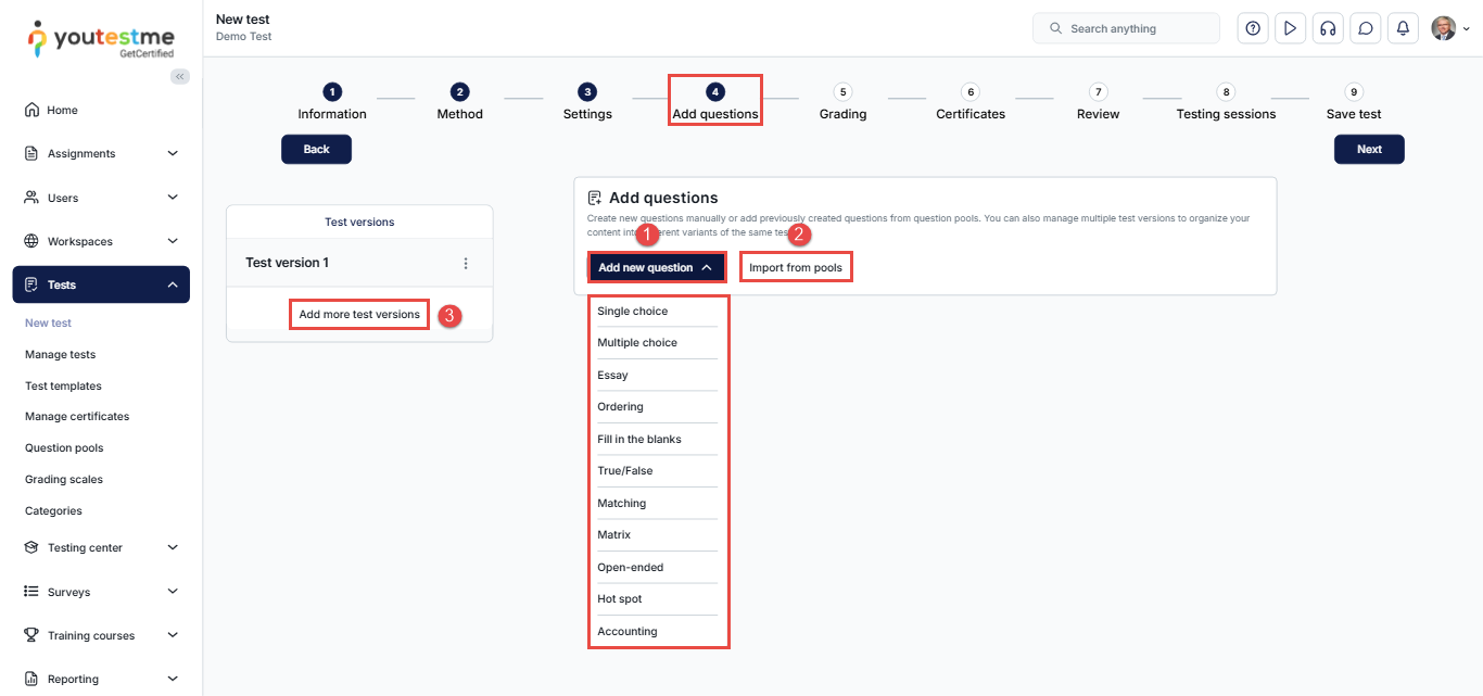 - Create questions manually for the test. You can create all question types directly within the wizard.