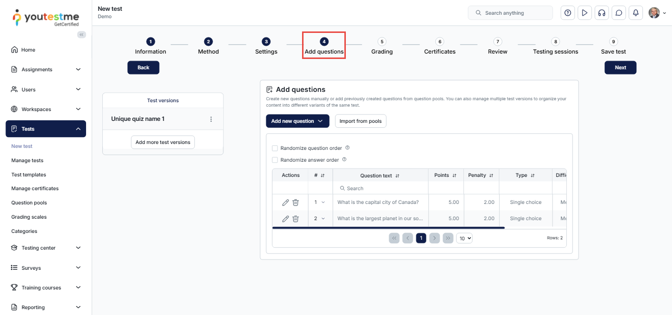 Each version can include a unique combination of questions, both manually created and imported from pools.
