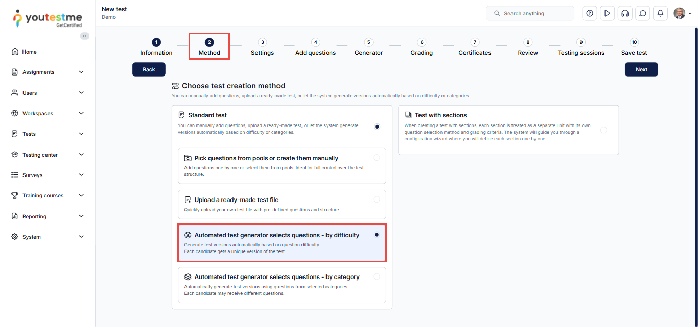 In Step 2 – Method, choose Automated Test Generator (Select Questions by Difficulty).