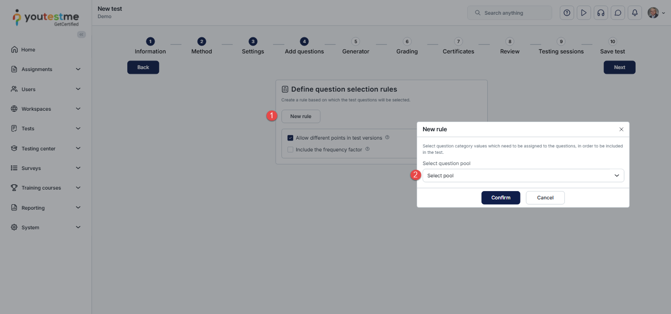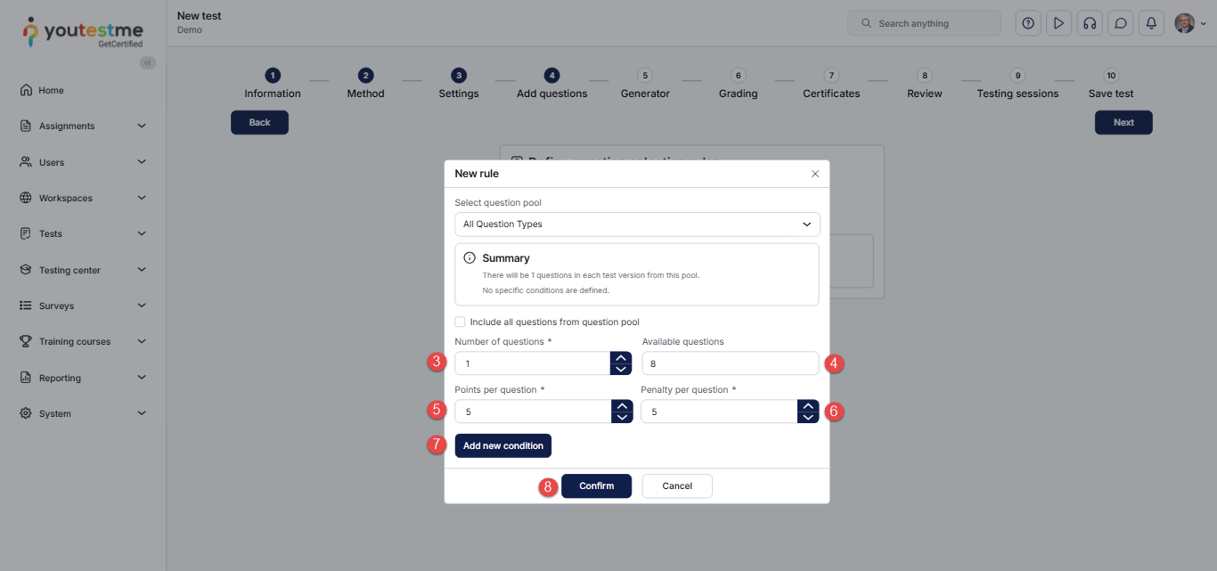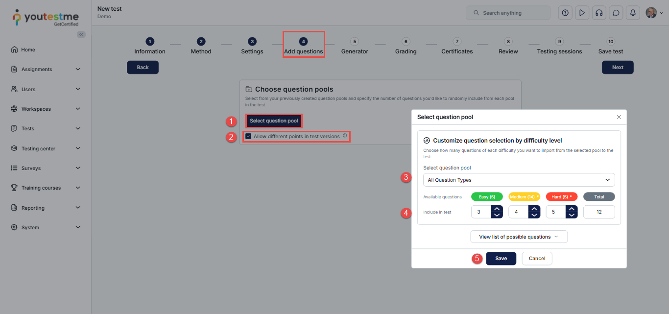 In Step 4 – Add Questions, select from your previously created question pools and specify how many questions of each difficulty level you want to include in the test.