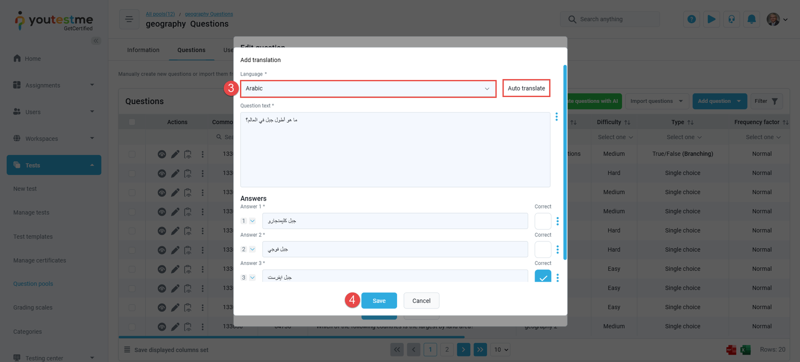 When adding a question to the question pool, YouTestMe offers the option to add multiple translations for the question. Translations can be either manually added or automatically generated.