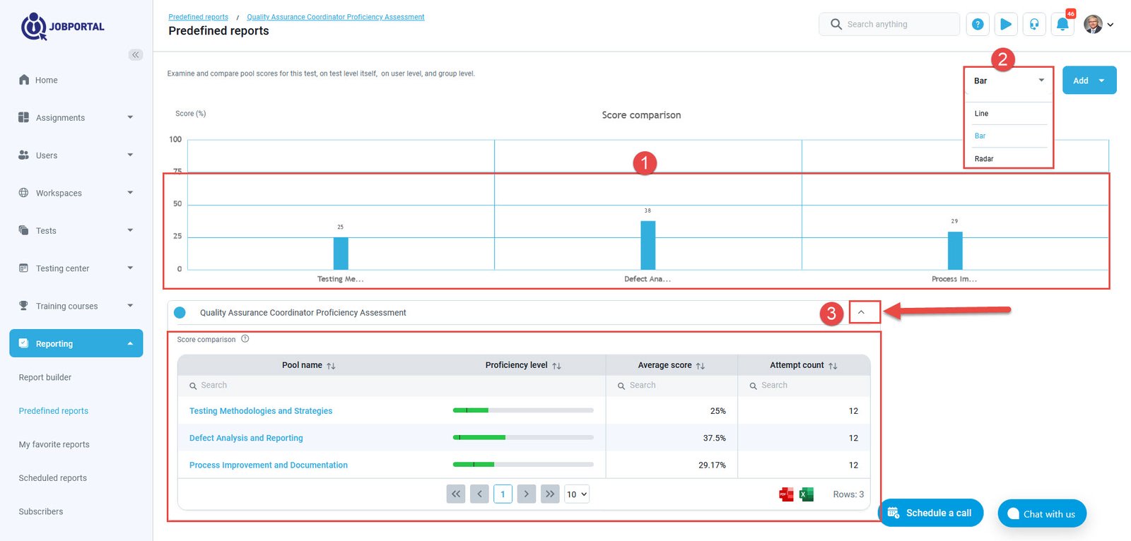 - On the chart, the compared performance of all candidates we’ve added is now displayed for each question pool.