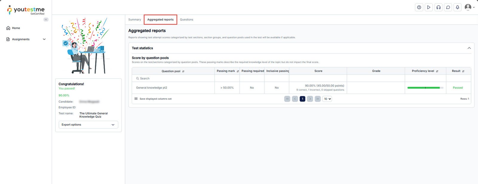Under the Aggregated reports tab, candidates can now access graphical representations illustrating their performance within each question pool. These visualizations utilize colored bars to showcase their strengths and areas for improvement vividly.