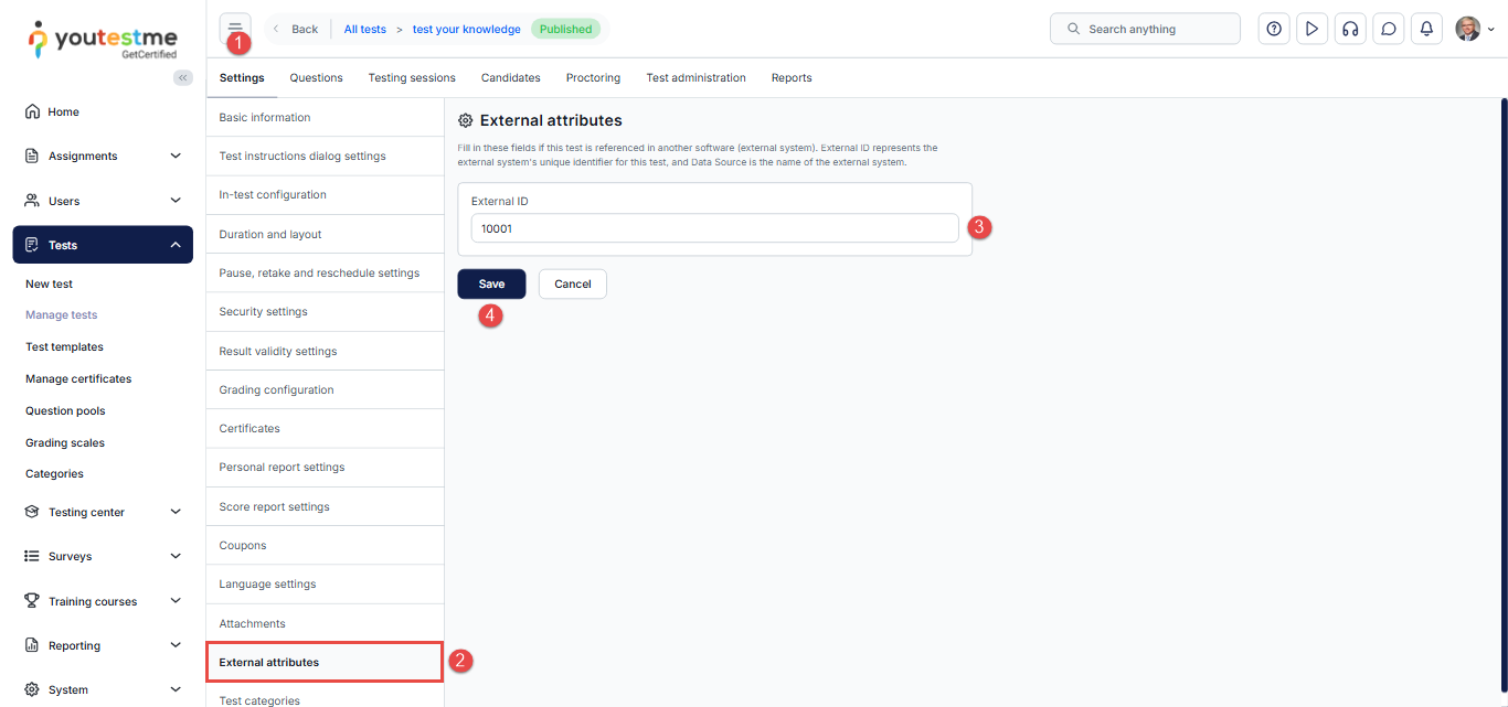 Note: If the External ID is not set, the YouTestMe internal ID must be stored in the external system to create authorizations.
