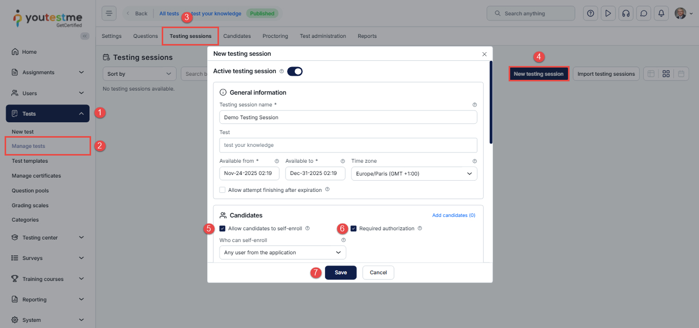 To allow users to book and start the test for which they are authorized, it is necessary to create at least one testing session that requires authorization.