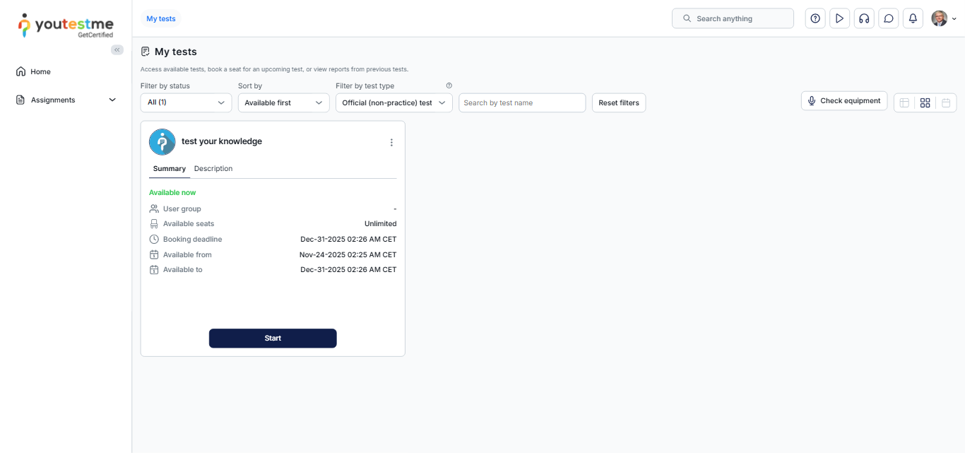Upon visiting the link, users will be automatically logged in and redirected to the My tests page, where they can start or book the test depending on the scenario.