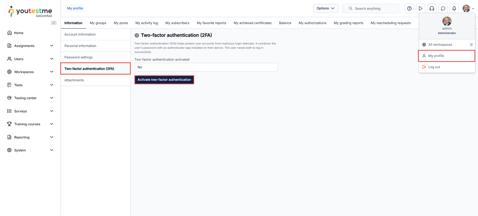 To activate the 2FA authentication, navigate to the My profile page and select the Activate two-factor authentication button.