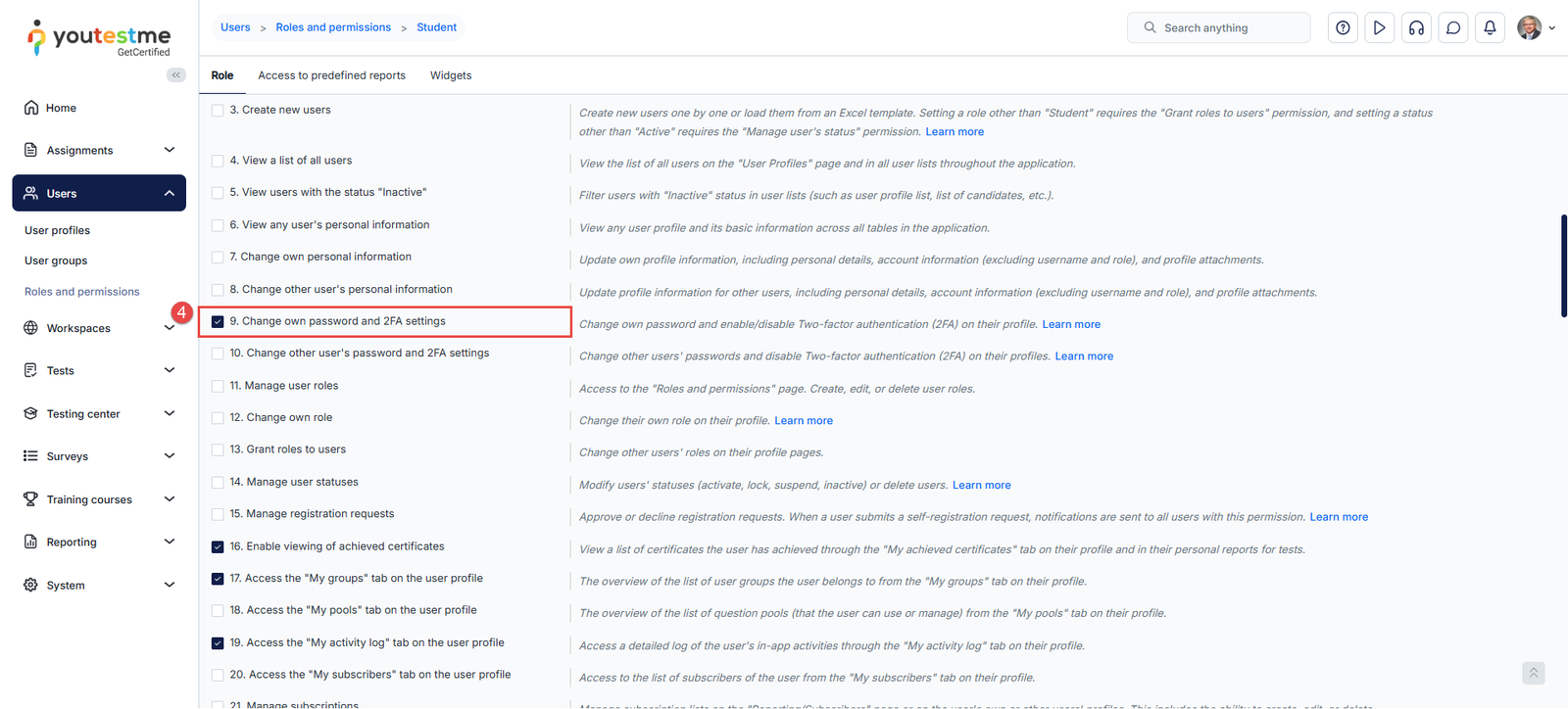 - Review the list of permissions for this role and check if Change own 2FA setting is enabled.