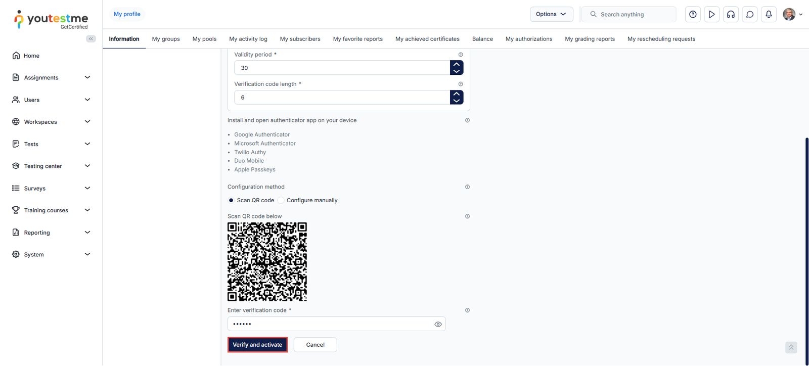 After scanning the QR code, you will get the code through your authentication app. Enter the code in the appropriate field and select the Verify and activate button.