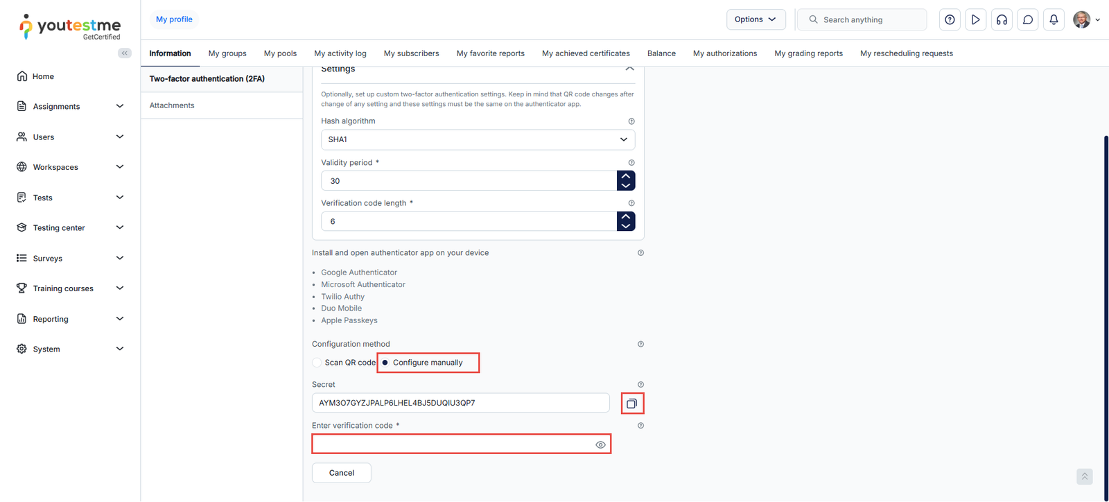 An additional method for setting up two-factor authentication entails a manual configuration process. Users input the provided secret key directly into their authentication app in this approach. Following this step, the user will receive a verification code to enter into the designated field to complete the setup.