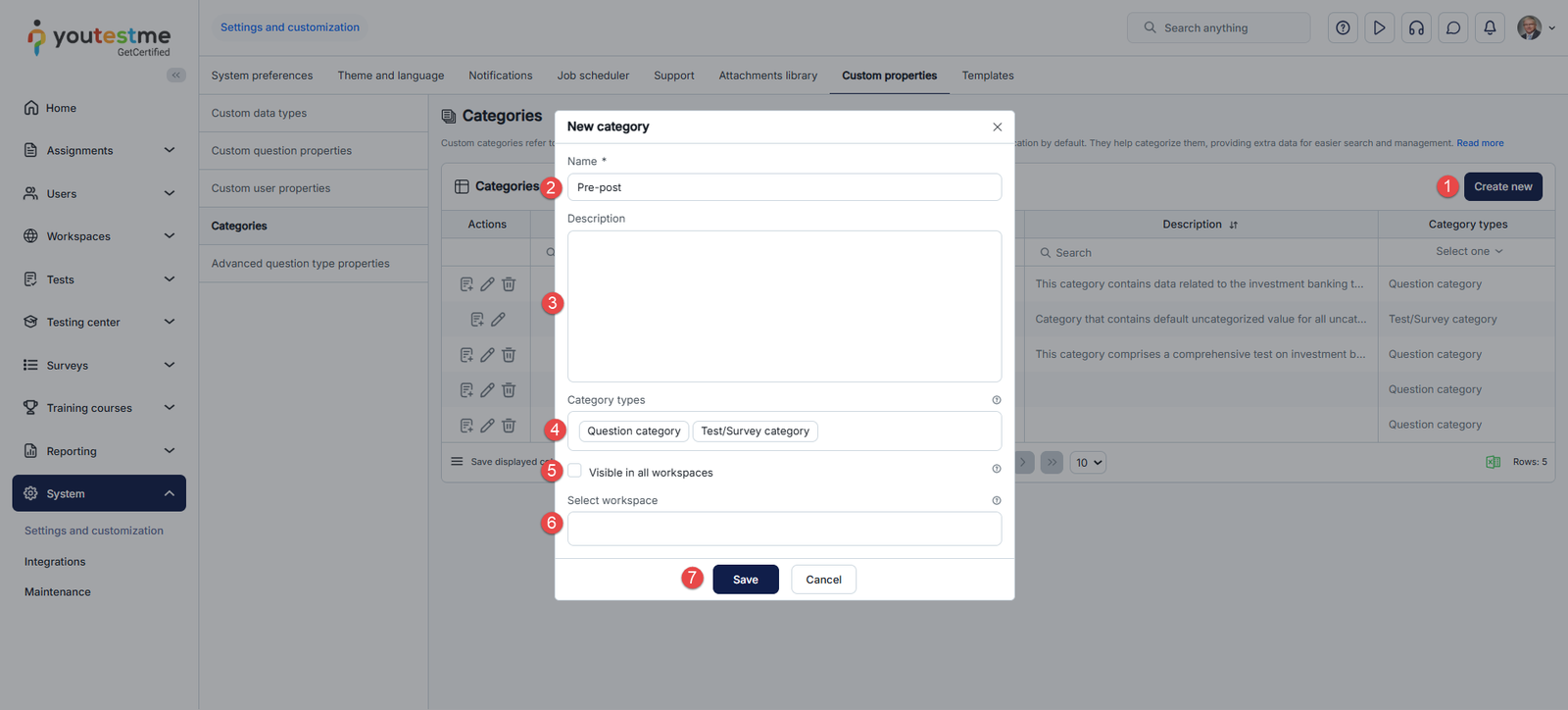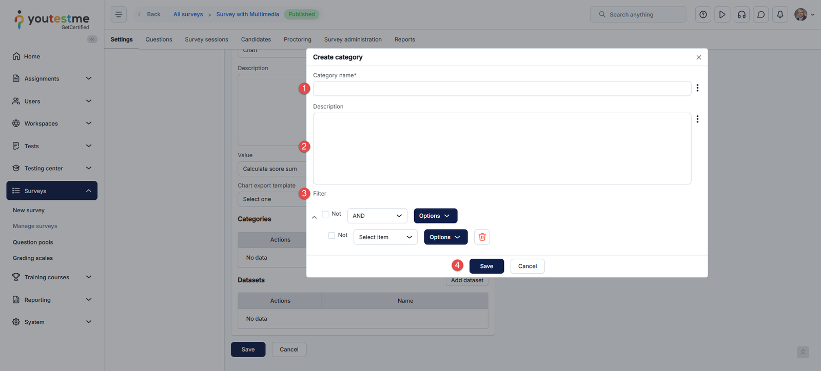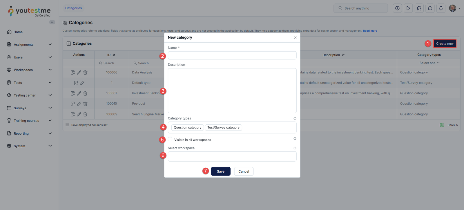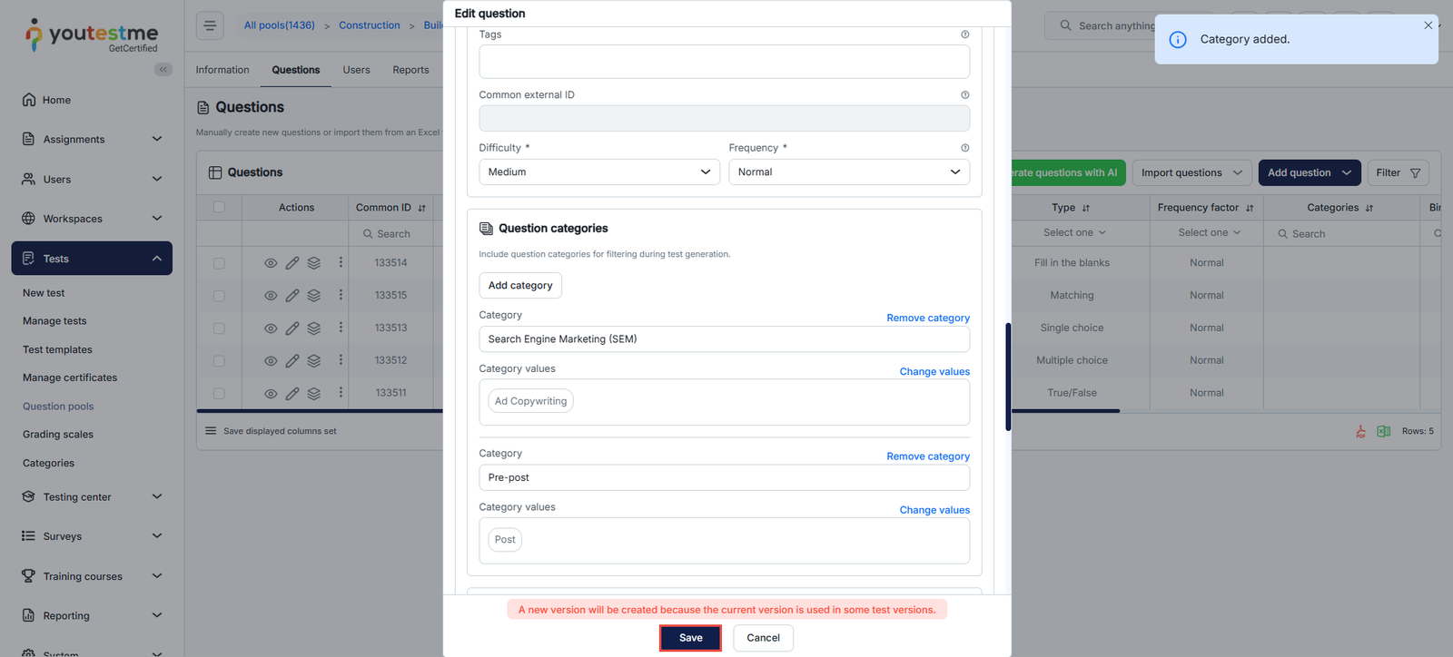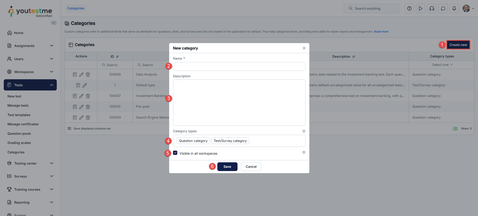 - Select the Category type for categorizing questions, tests/surveys, or both.