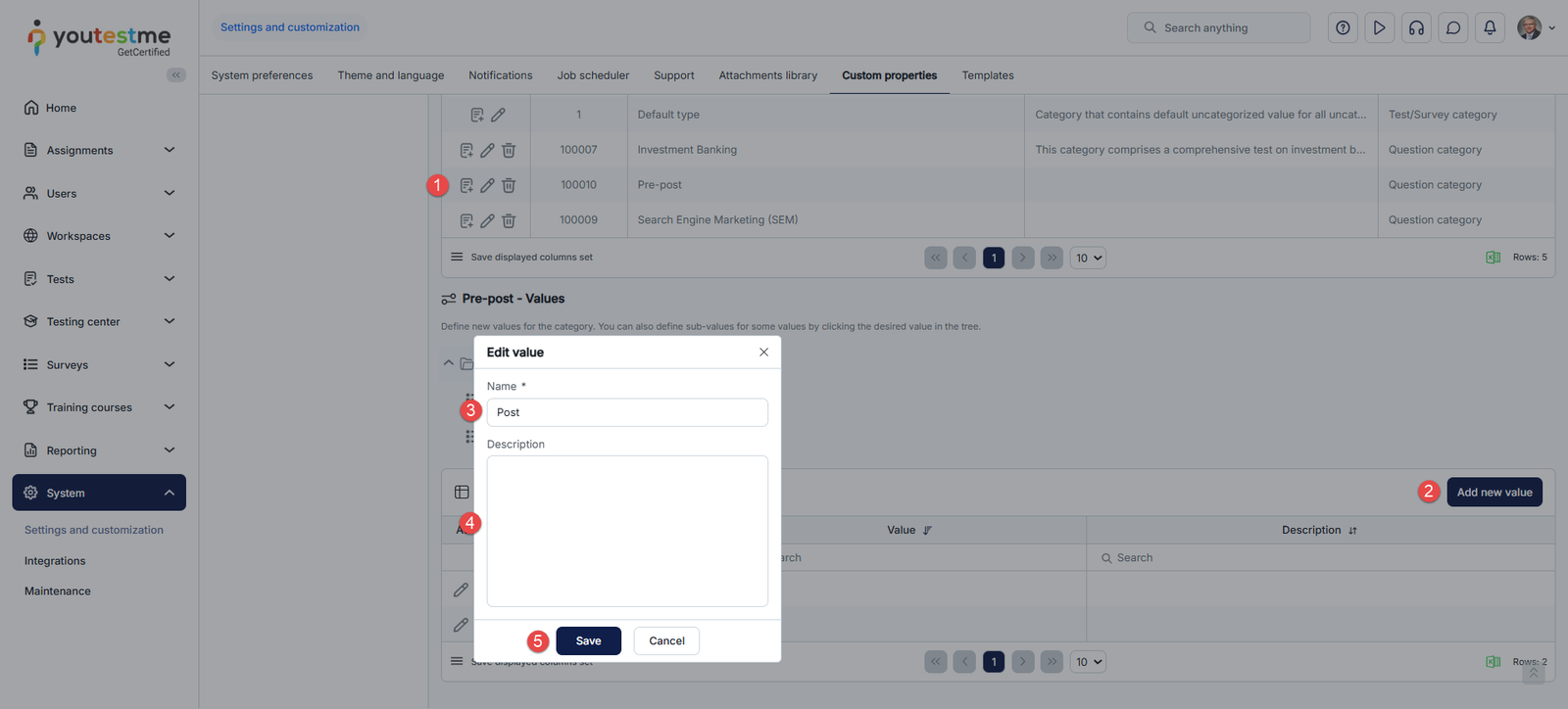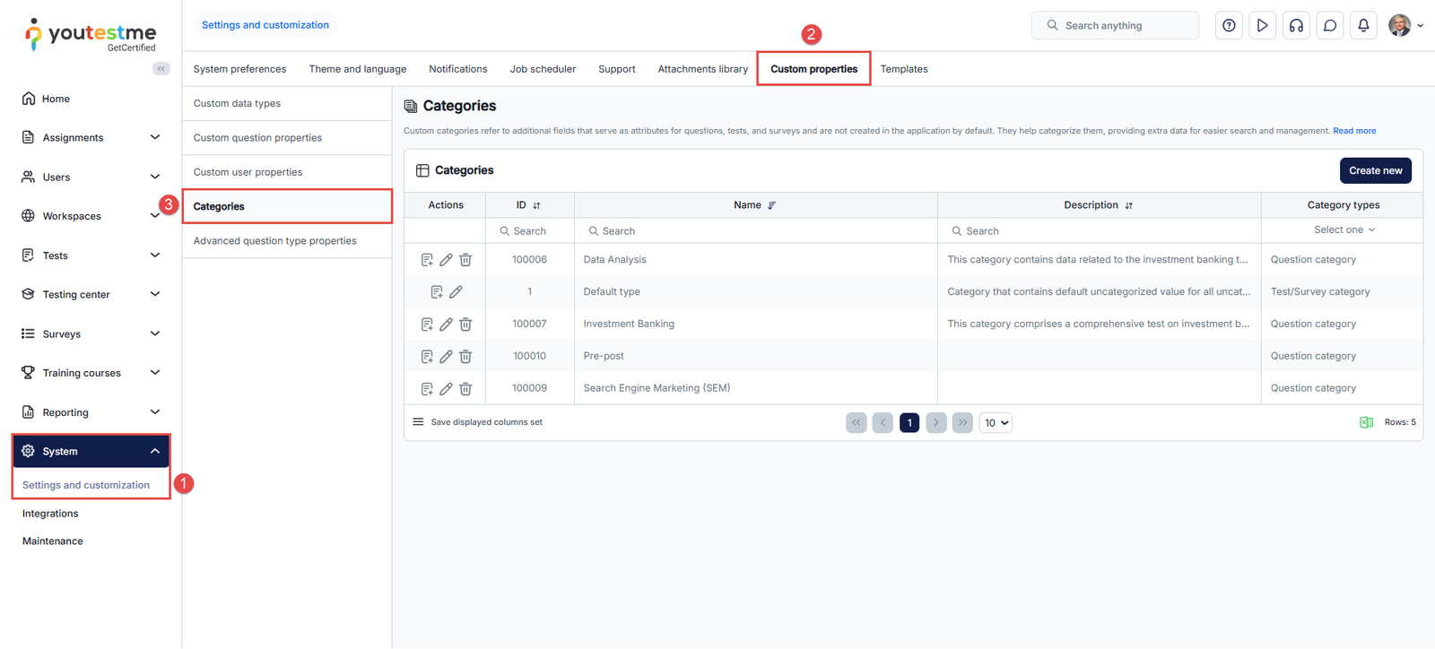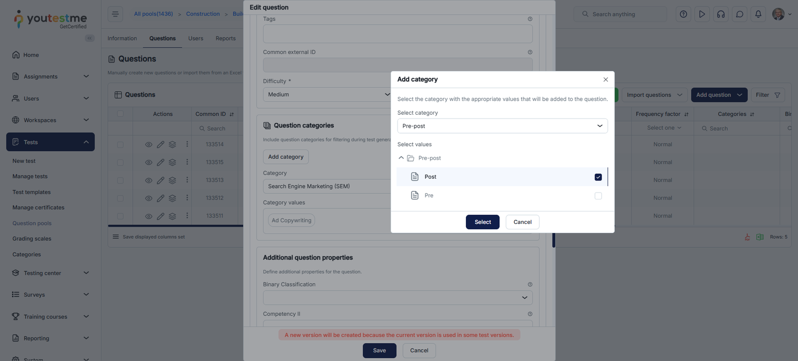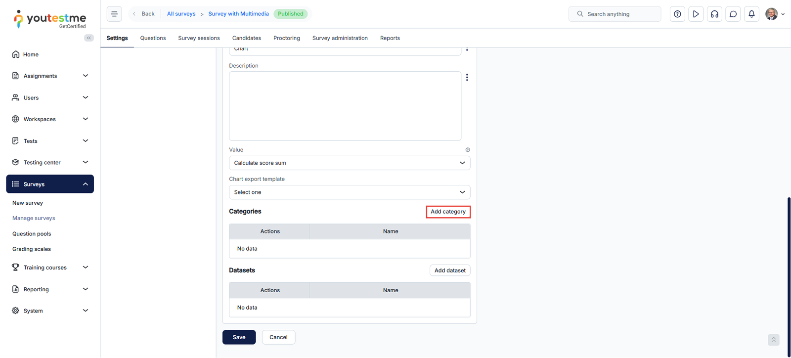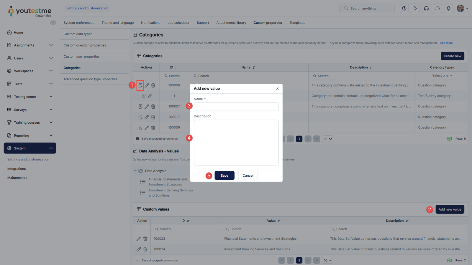 - Select the Category type for categorizing questions, tests/surveys, or both.