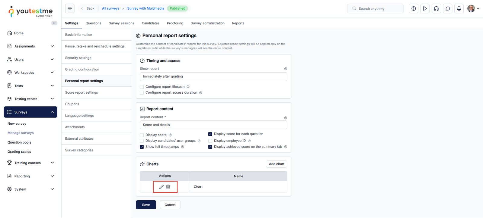 - Go to the Tests/Survey section in the left-side menu and click on the Manage tests/Manage Survey page.