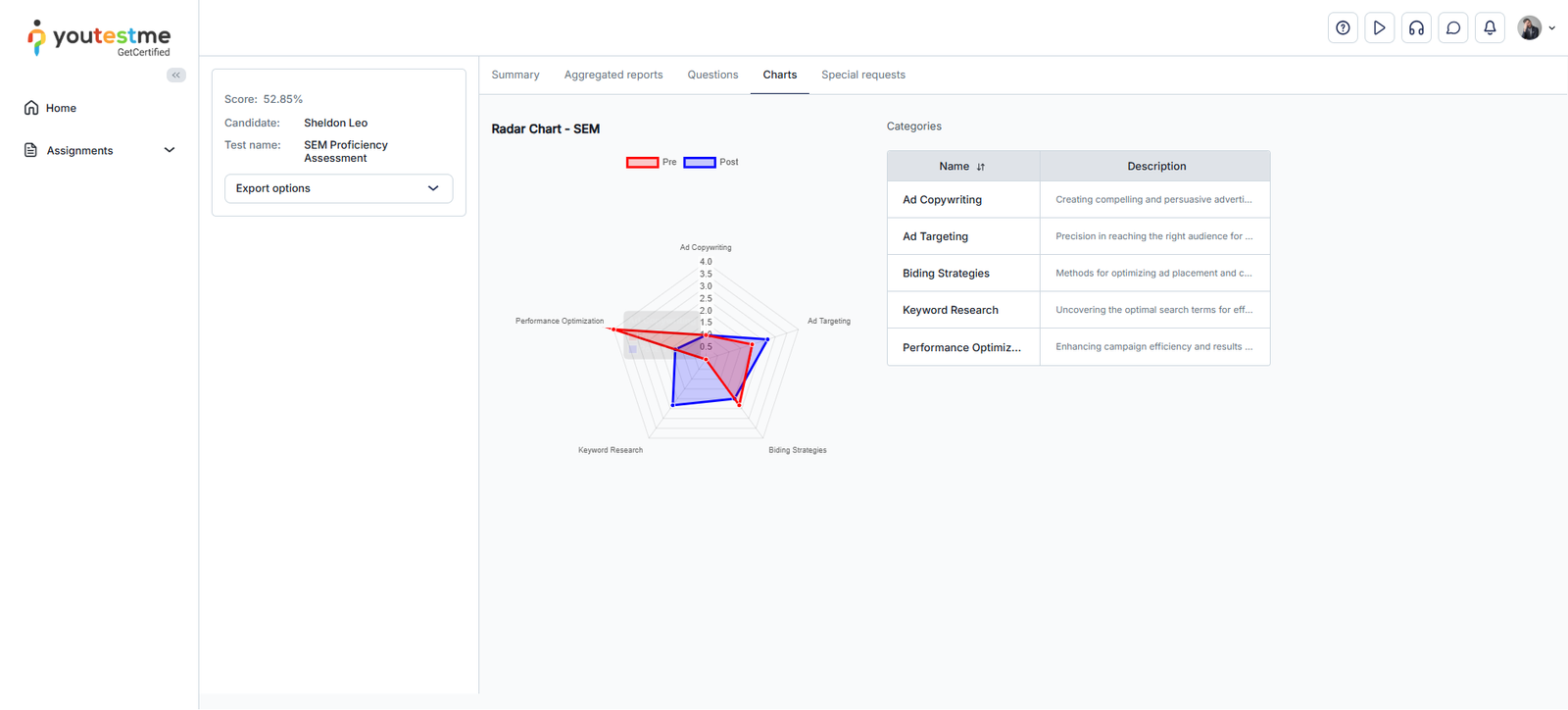 Once students complete the exam, they can access the radar chart by opening the Charts tab within their personal reports.