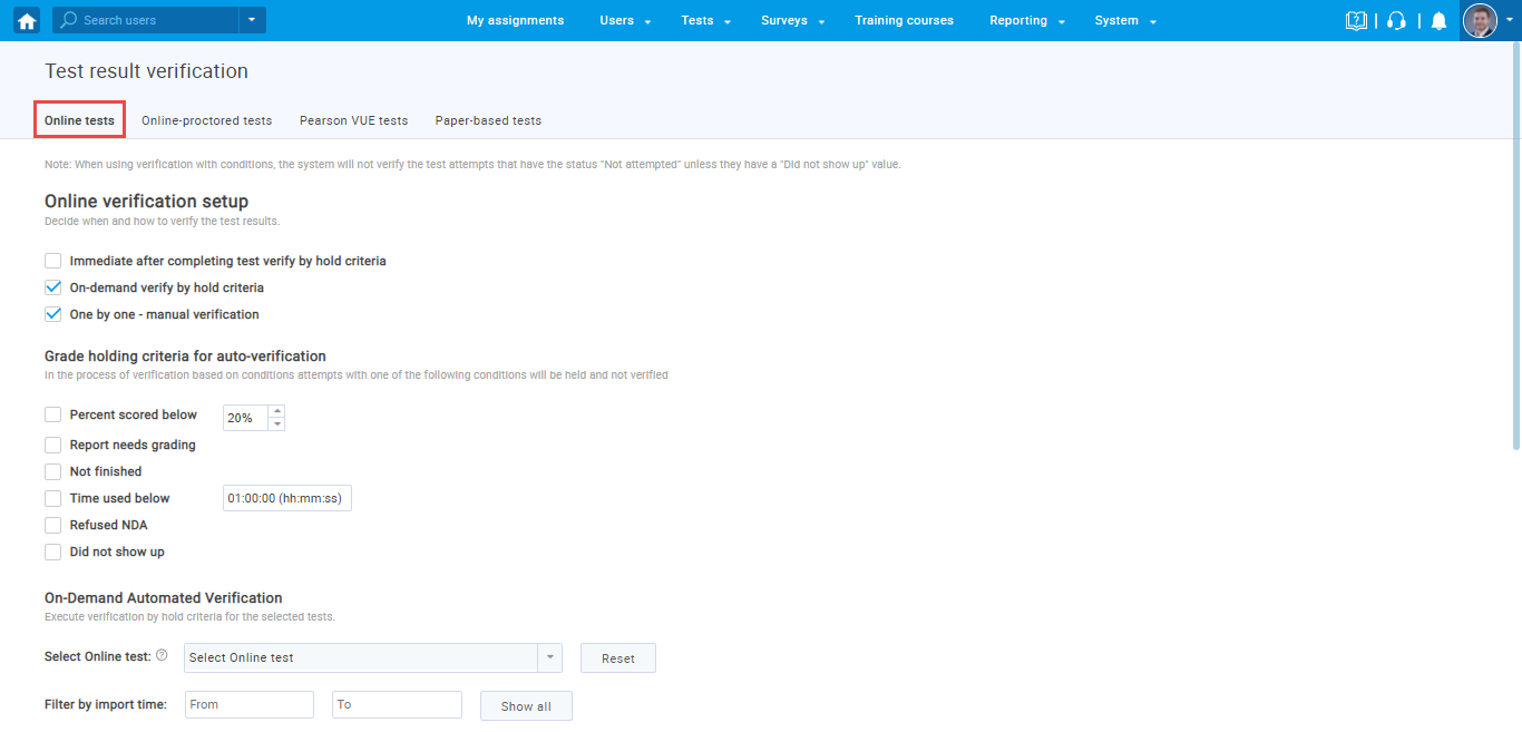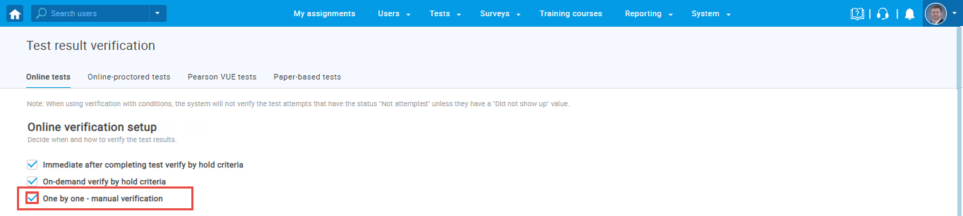 An online verification setup allows you to decide when and how to verify the test results. There are three options to setup online verification: