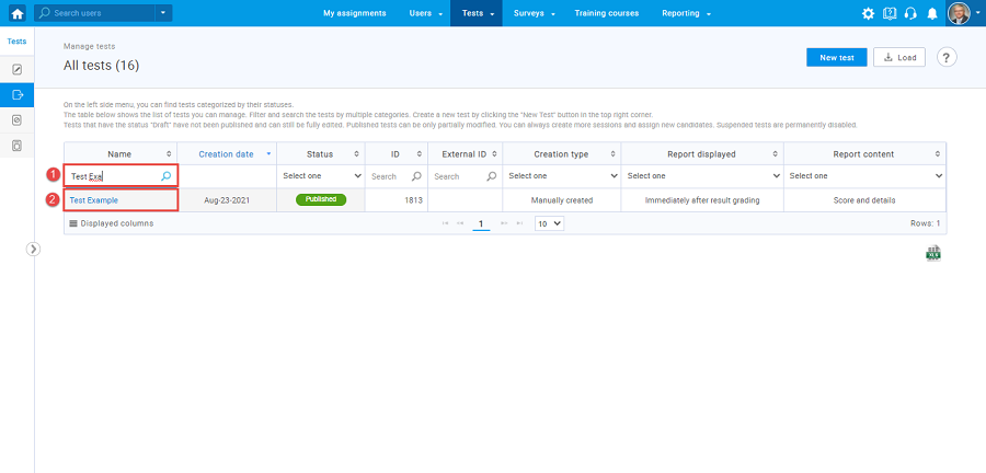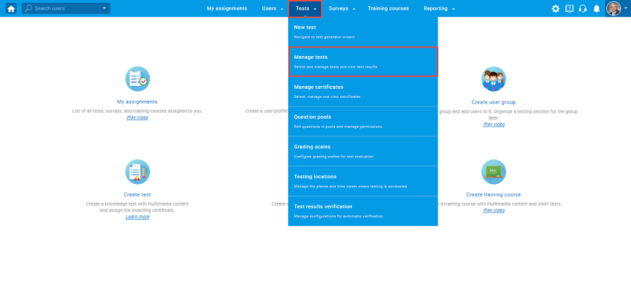 Hover over the “Tests” in the main menu, and select the “Manage tests“.